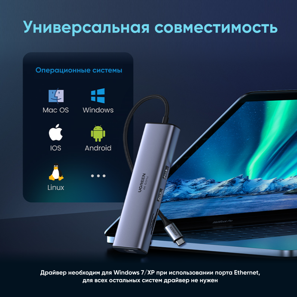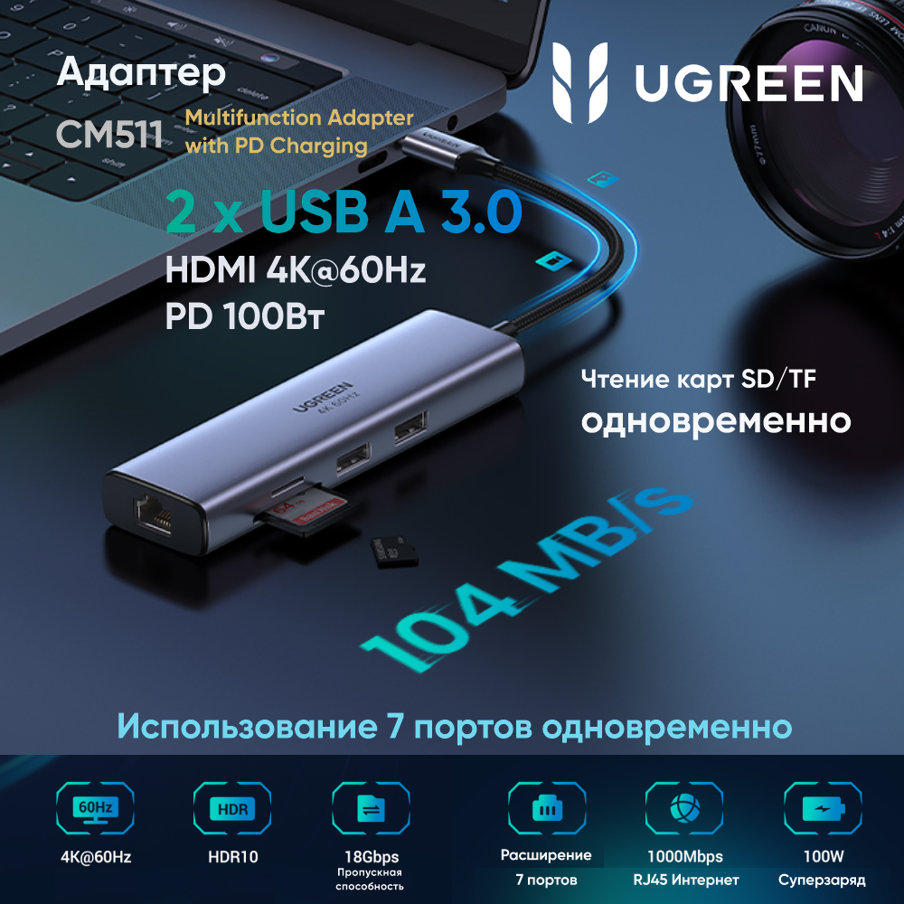 | Дополнительная информация | USB концентратор Ugreen 6 в 1 (хаб), 2 х USB 3.0, HDMI, TF/SD, PD |