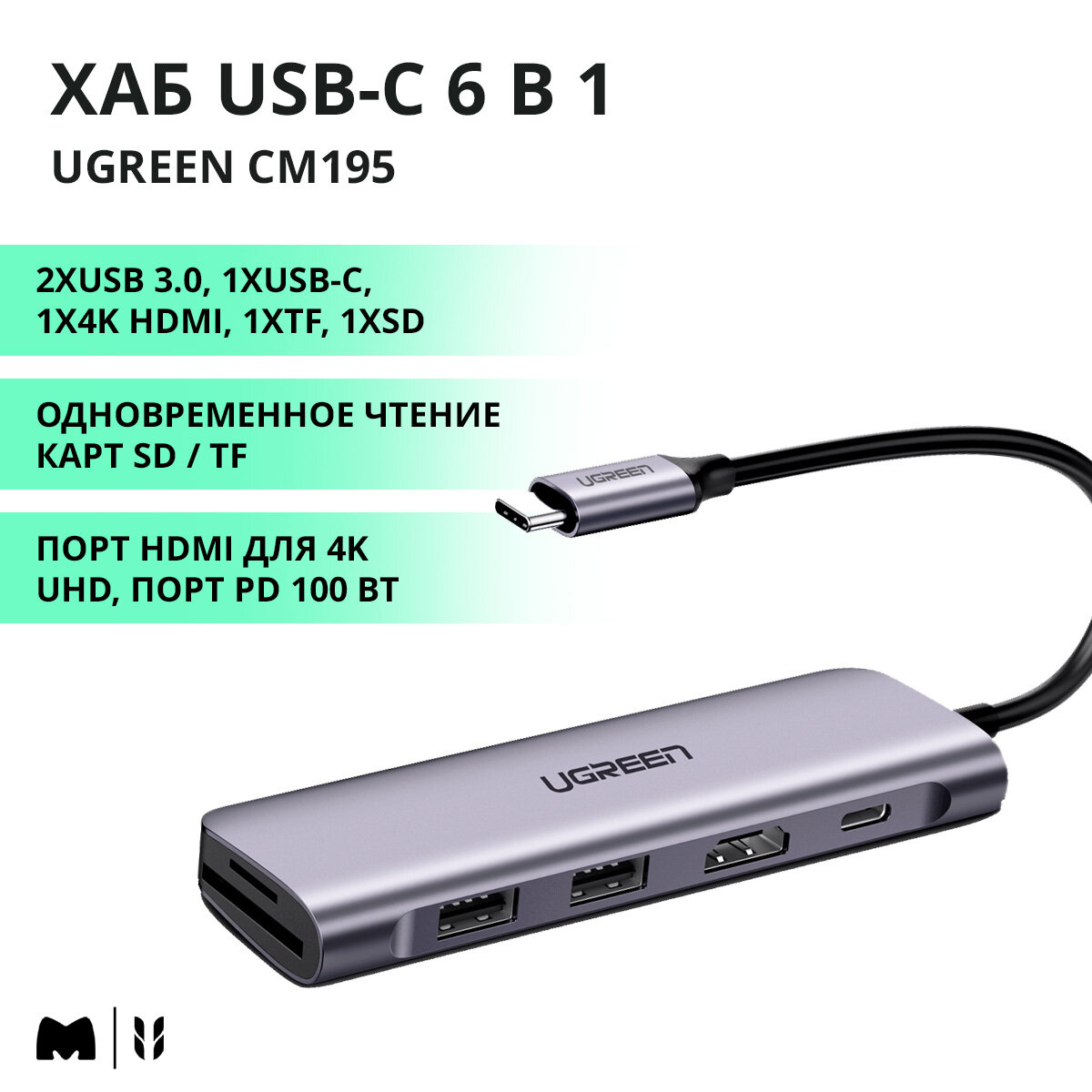UGREEN. USB концентратор 6 в 1 (хаб), HDMI, 2 x USB 3.0, SD/TF, PD (70411)