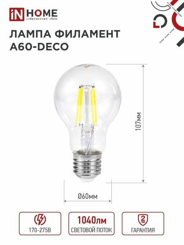 Лампа светодиодная IN HOME LED-A60-deco, 11 Вт, 230 В, Е27, 4000 К, 1160 Лм, прозрачная