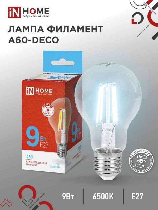 Лампа светодиодная IN HOME LED-A60-deco, 9 Вт, 230 В, Е27, 6500 К, 810 Лм, прозрачная