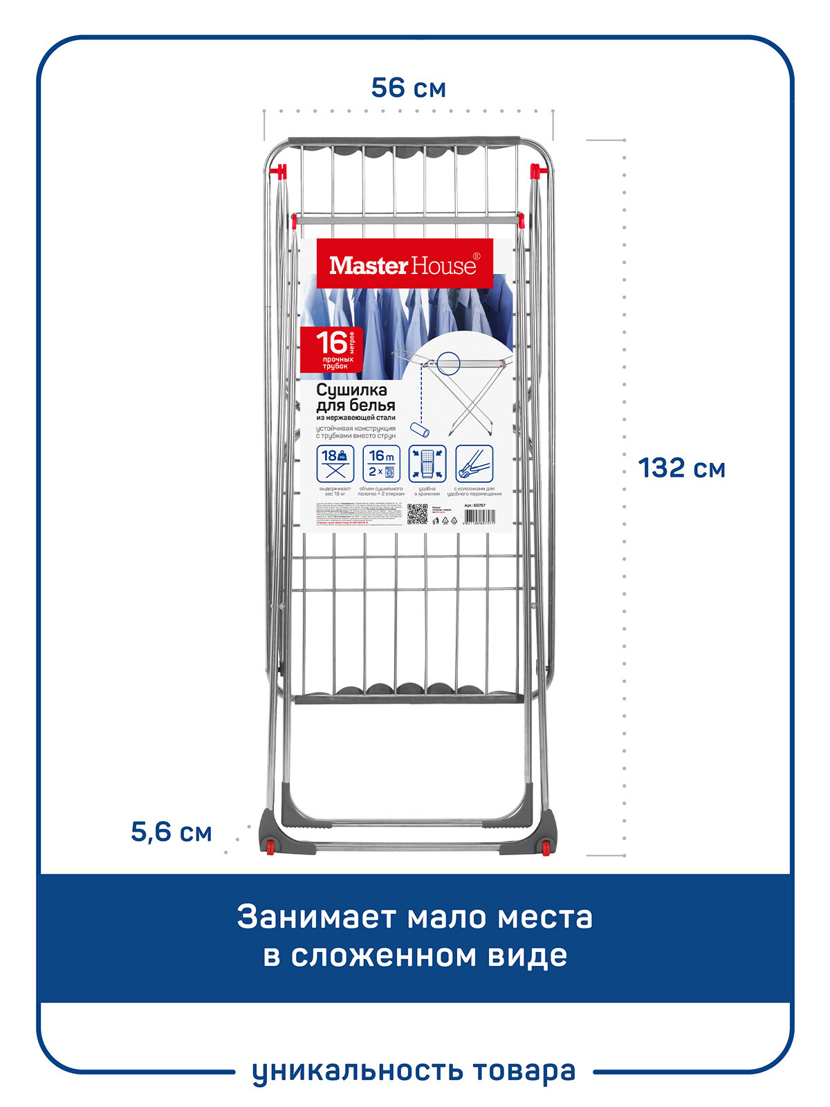 Сушилка для белья напольная Master House 55х5,5х127 см, с колесиками, 18 трубок, 60757