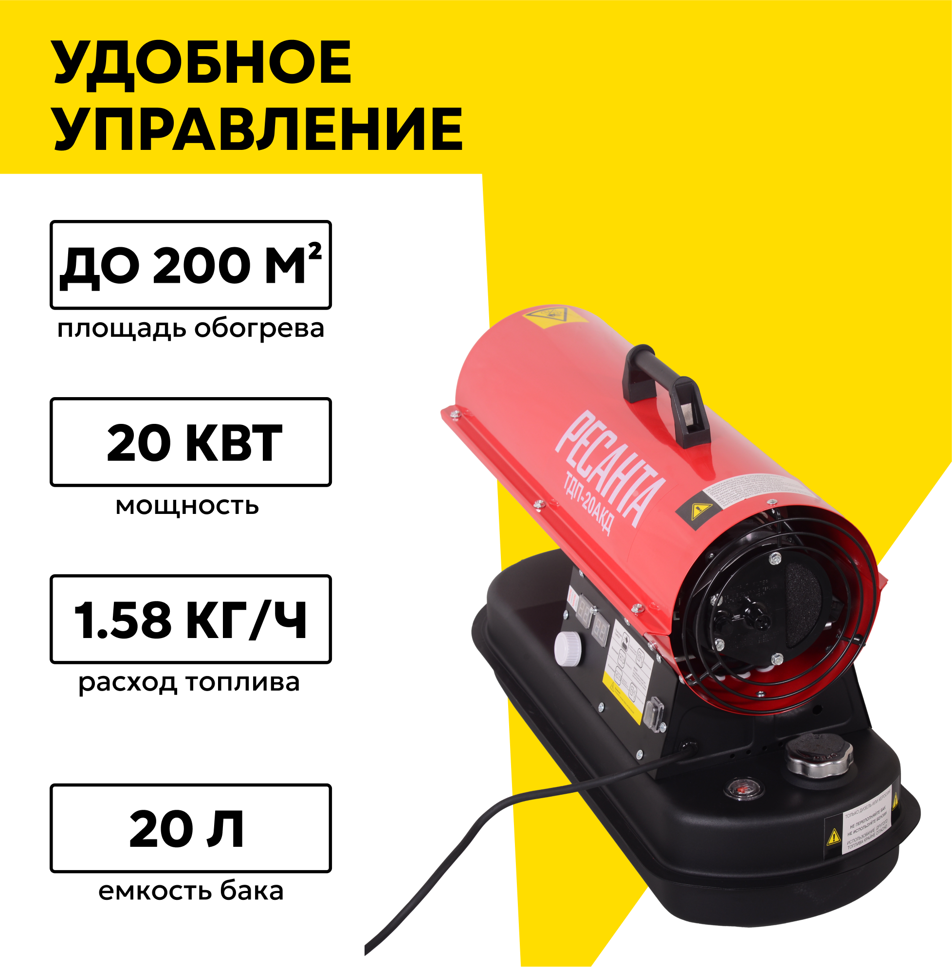 Ниже Вы можете прочитать отзывы на Тепловая дизельная пушка ТДП-20АКД Ресанта, 20кВт, площадь обогрева до 200м2, ознакомится с подробными характеристиками, посмотреть интересные обзоры и фотографии на Тепловая дизельная пушка ТДП-20АКД Ресанта, 20кВт, площадь обогрева до 200м2.