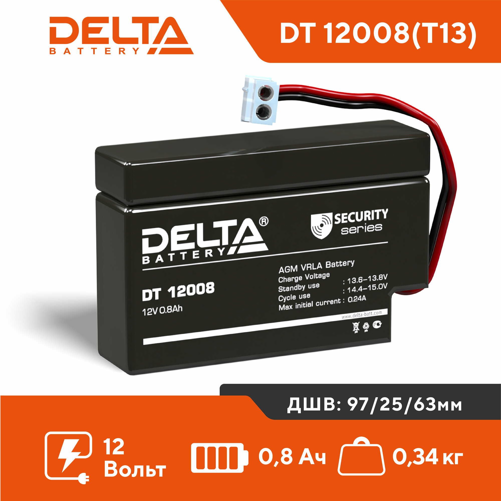 Аккумулятор DELTA DT-12008 (12В, 0.8Ач / 12V, 0.8 Ah / вывод T13) Для слаботочных систем