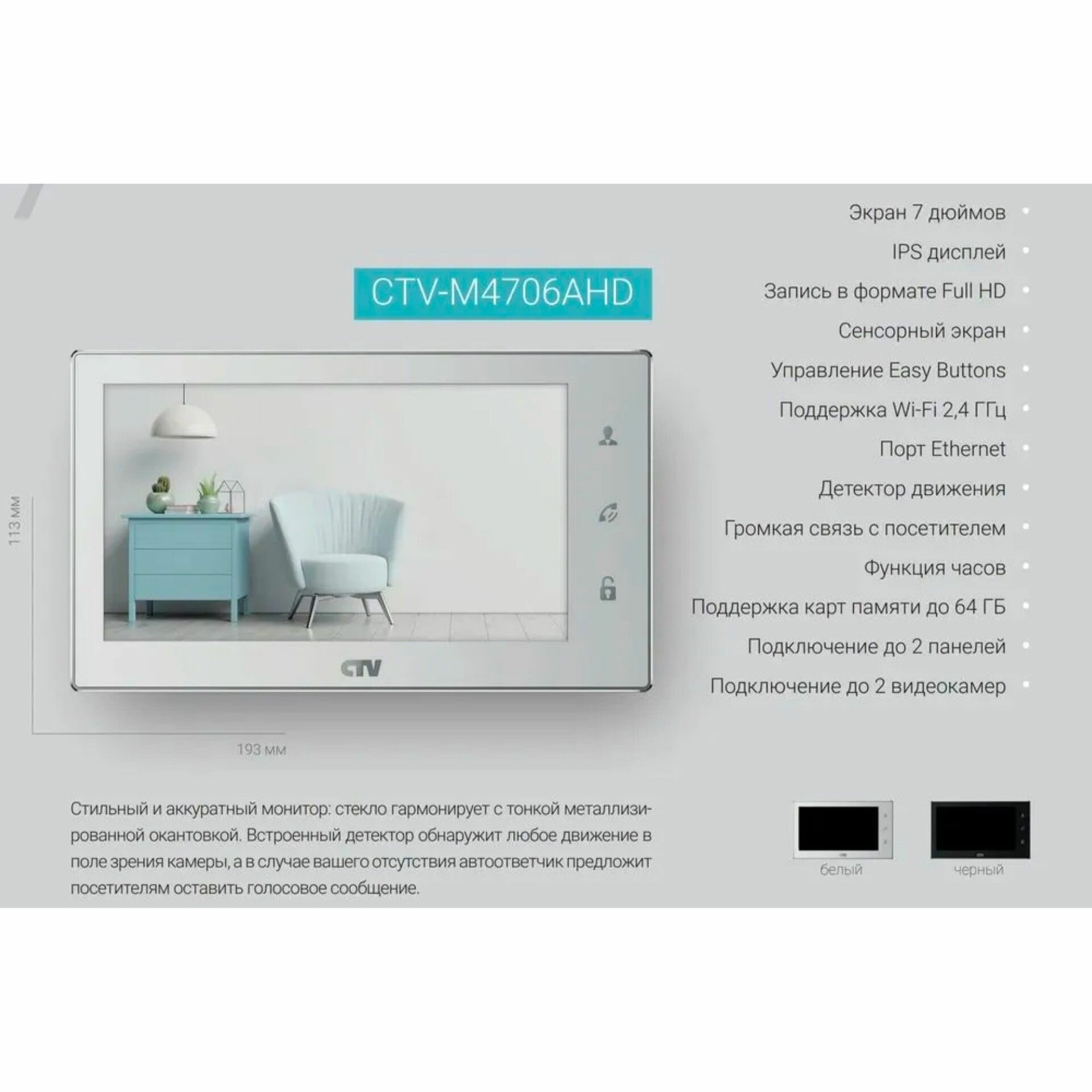 CTV-M4706 (Черный) Видеодомофон для квартиры или частного дома, с записью по детекции движения, автоответчик, сенсорный IPS экран 7", cовместим с подъездным домофоном через модуль сопряжения