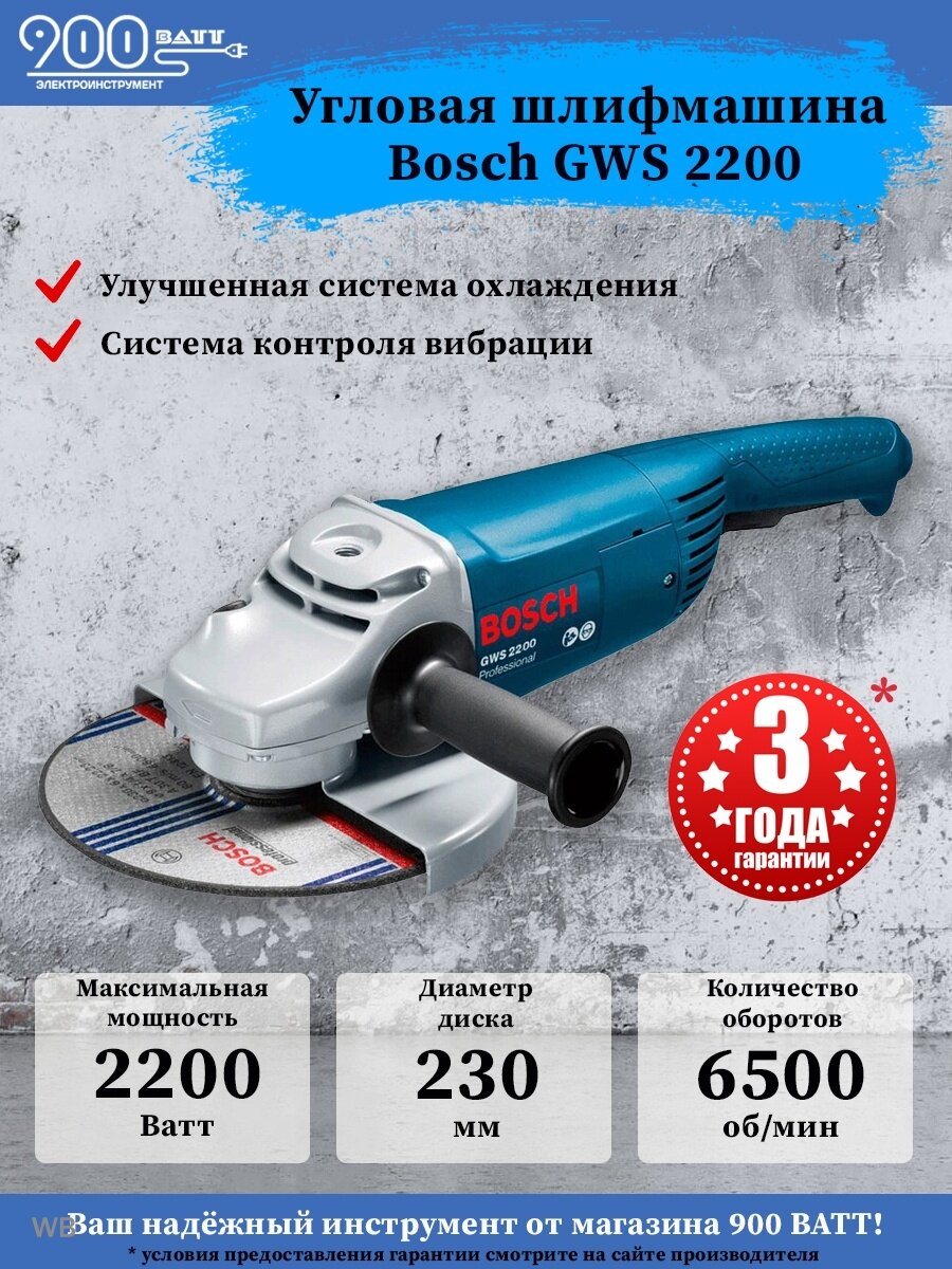 Углошлифовальная машина BOSCH GWS 2200 2200Вт, 6500об/мин, 230мм, 5,4кг
