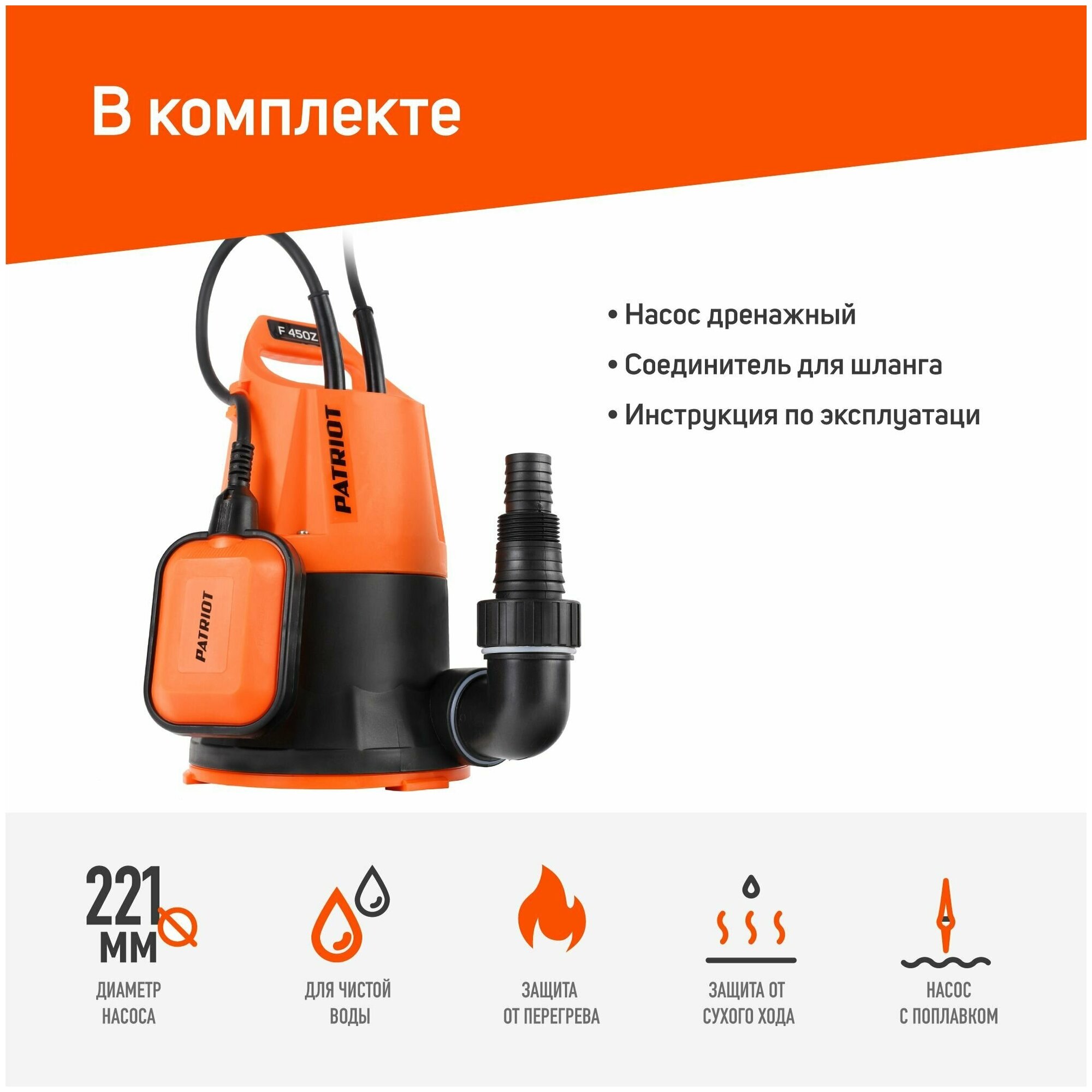Насос дренажный PATRIOT F 450Z, для чистой воды, 450 вт, 8000 л/ч