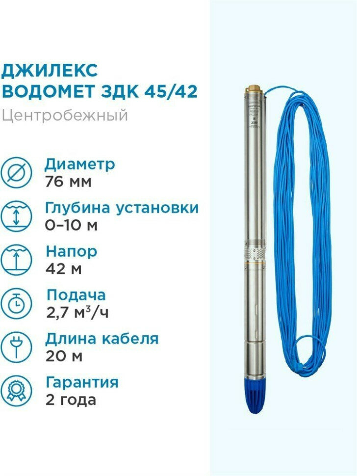 ДЖИЛЕКС Насос погружной скважинный ДЖИЛЕКС водомет ЗДК 45/42, 45 л/мин, Н-42 м, d-76 мм, каб. 20 м. Насос для скважин центробежный