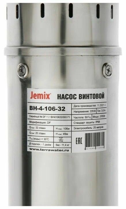 Насос погруж винт, Jemix, 1 '', 25 м, 370 Вт, погруж35 м, напор106 м, 1.2 м³/ч, с защитой, ВН-4-106-