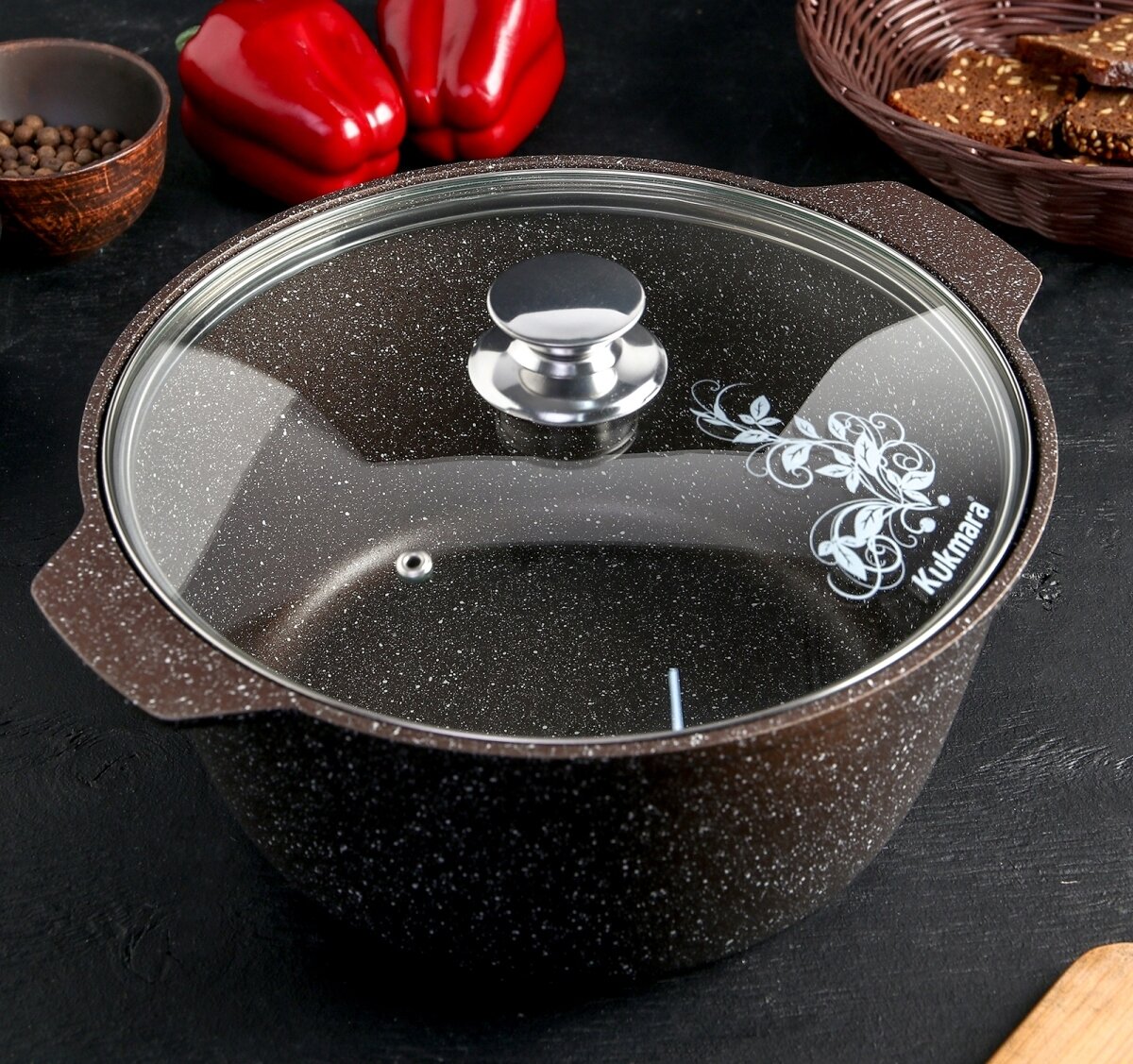 Кастрюля алюминиевая литая а/приг. Kukmara "Мраморная" кофейн "жаровня" 3,0л Стекл.кр. жмк32а (Кукмор)