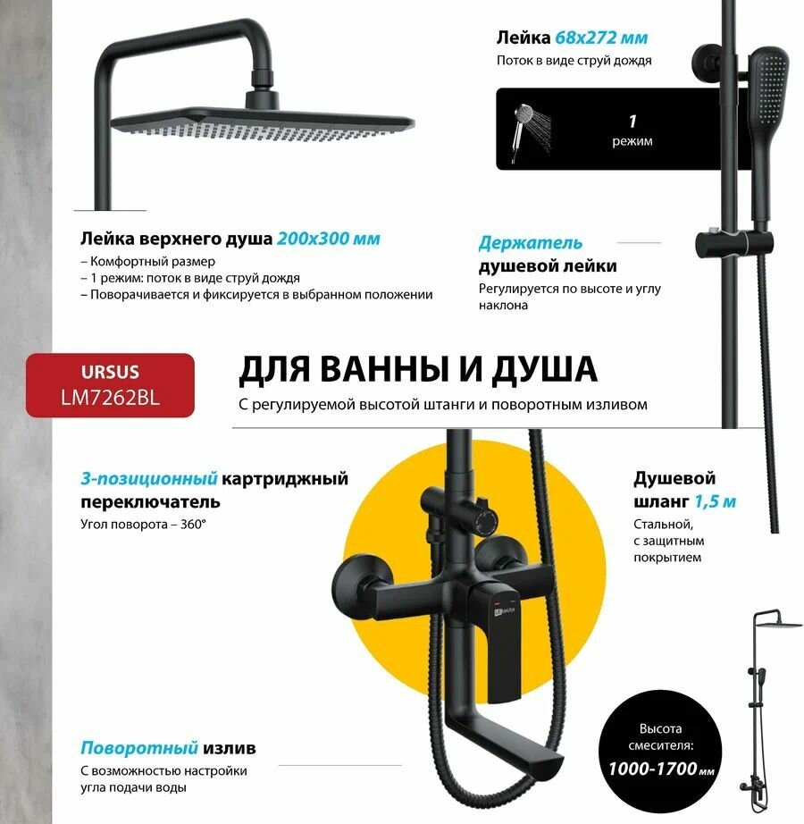 Купить Смеситель для ванны и душа с верхней душ. лейкой Троп. дождь, с 1-функц. лейкой, черный LEMARK LM7262BL Ursus