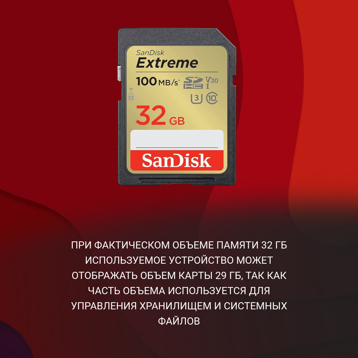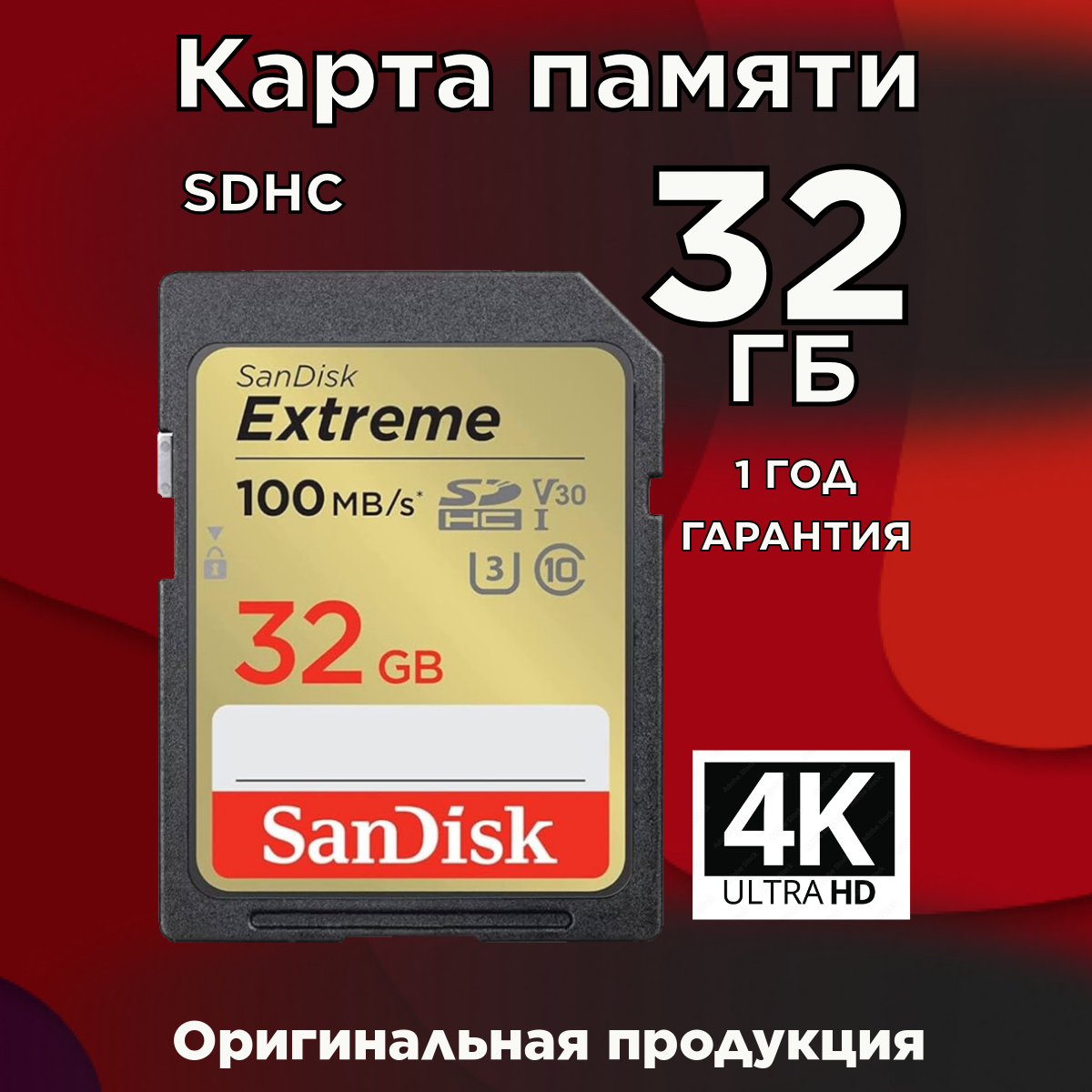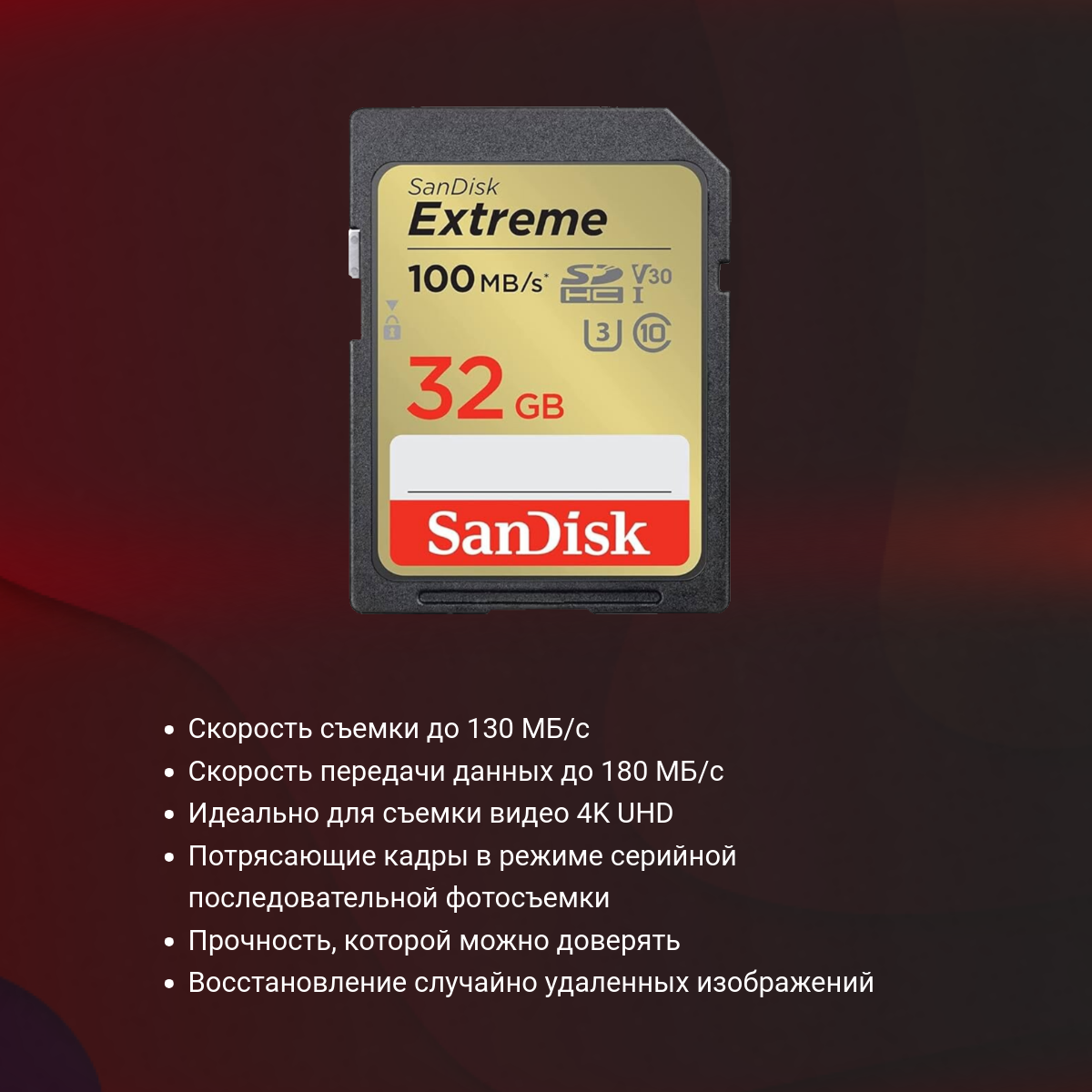 Карта памяти SanDisk Extreme SDXC 32 ГБ Class 10 UHS-I U3 V30 (R/W 100/60 Mb/s)
