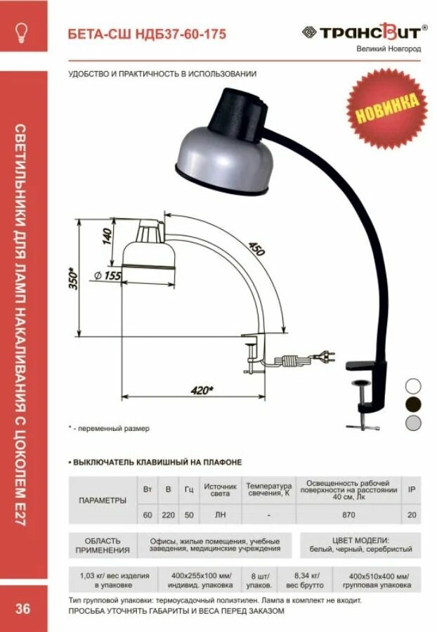СохранитьЛампа настольная Бета-СШ на струбцине, 60Вт, 220В, Е27, серебро, Трансвит интересное: