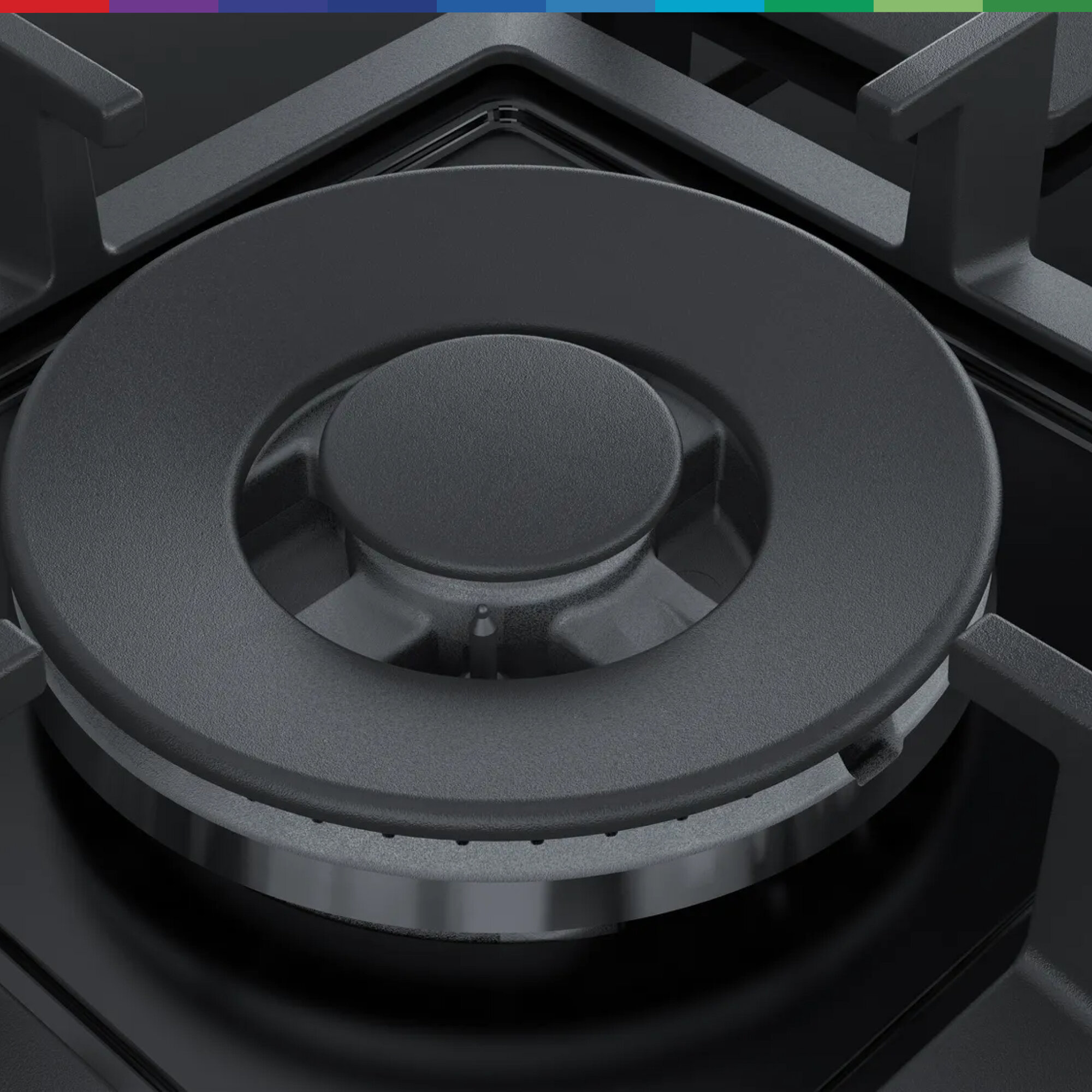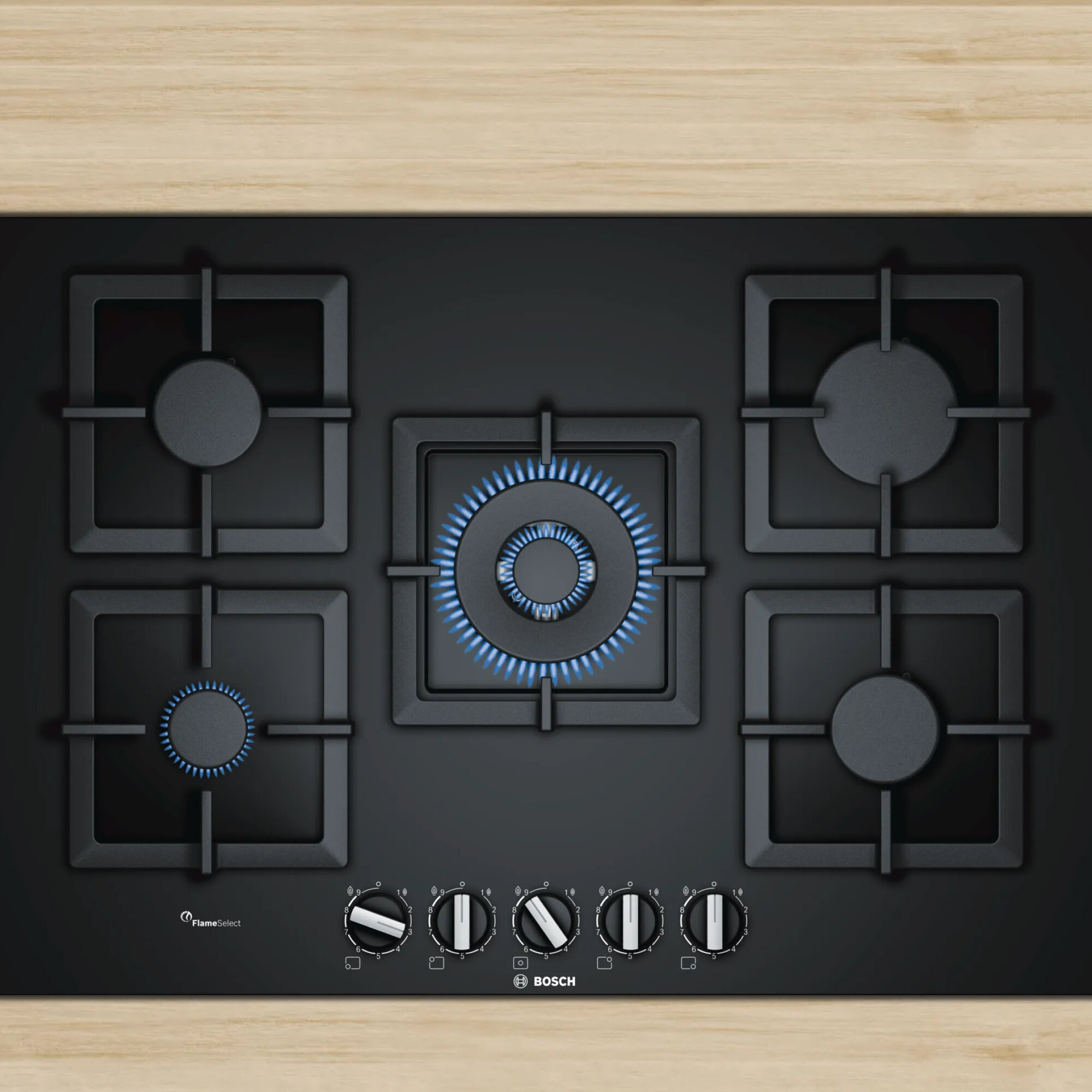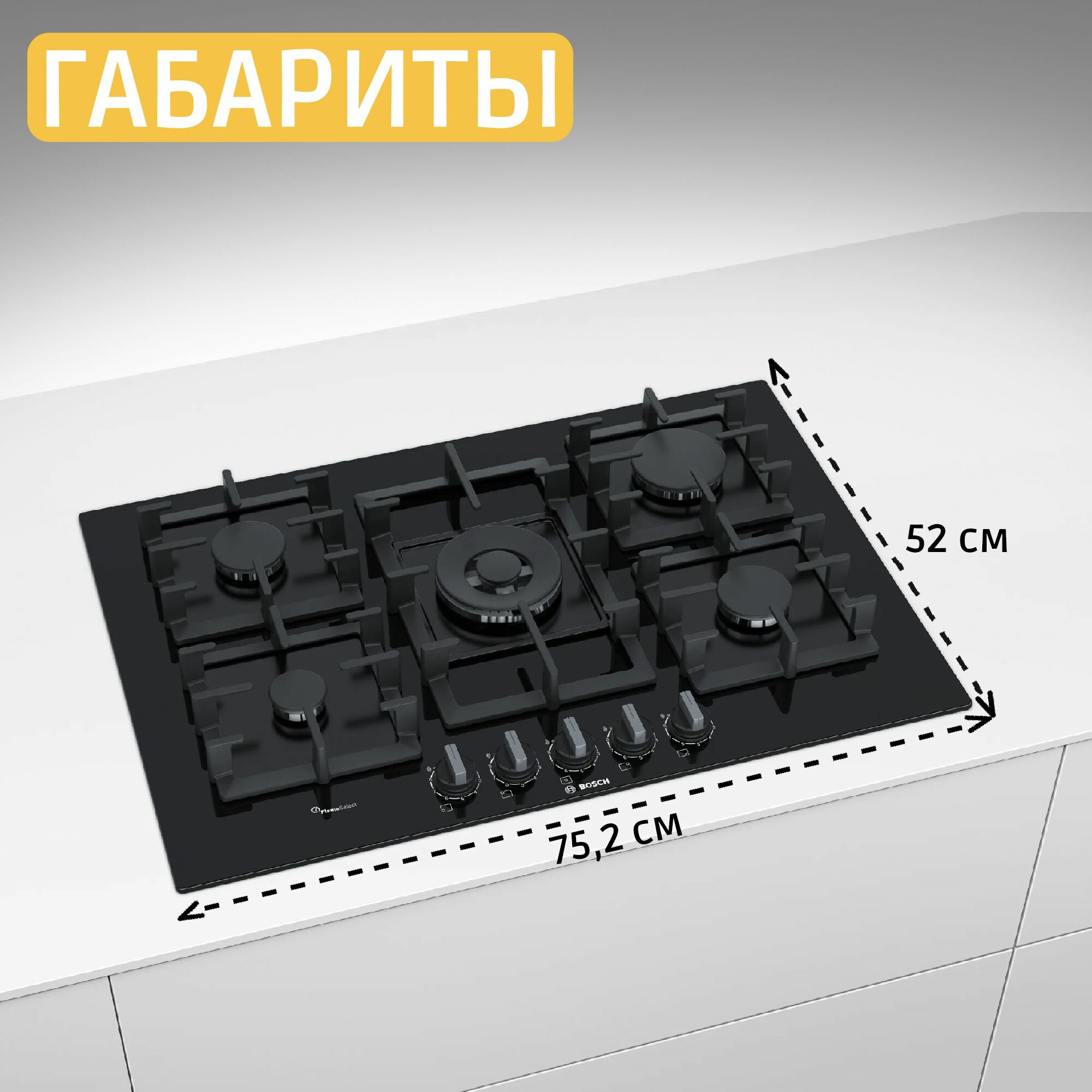 BOSCH Встраиваемая газовая панель BOSCH варочная панель, 75см, закаленное стекло, черная, 5 конфорок, 1 WOK-конфорка c 2 контурами пламени, 1 конфорка повышенной мощности, FlameSelect, индивидуальные чугунные решетки, газ-контроль, автоматический электроп