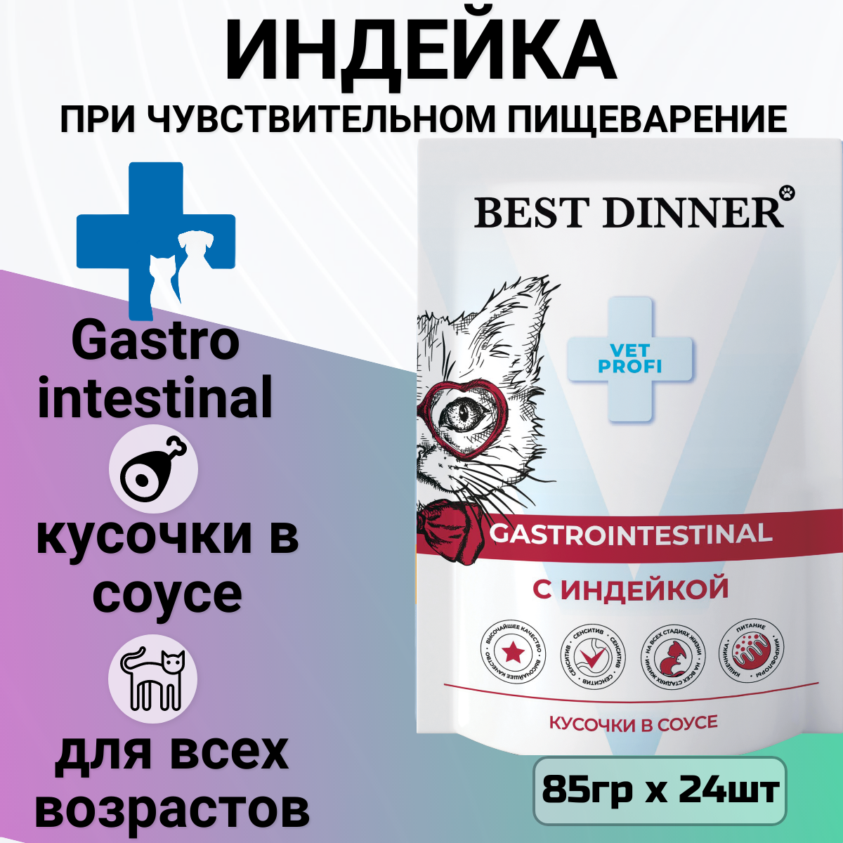 Влажный корм для кошек Best Dinner Exclusive Vet Profi GastroIntestinal при проблемах с ЖКТ, кусочки индейки в соусе,12*85 гр (12 шт.)