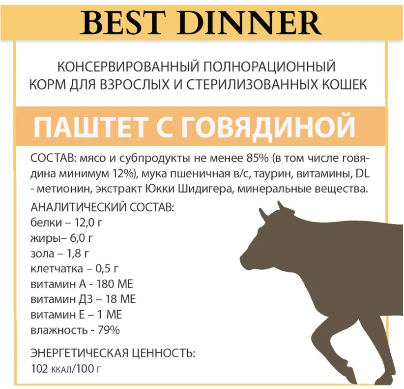 Купить Best Dinner 14шт по 100г говядина паштет для стерилизованных кошек