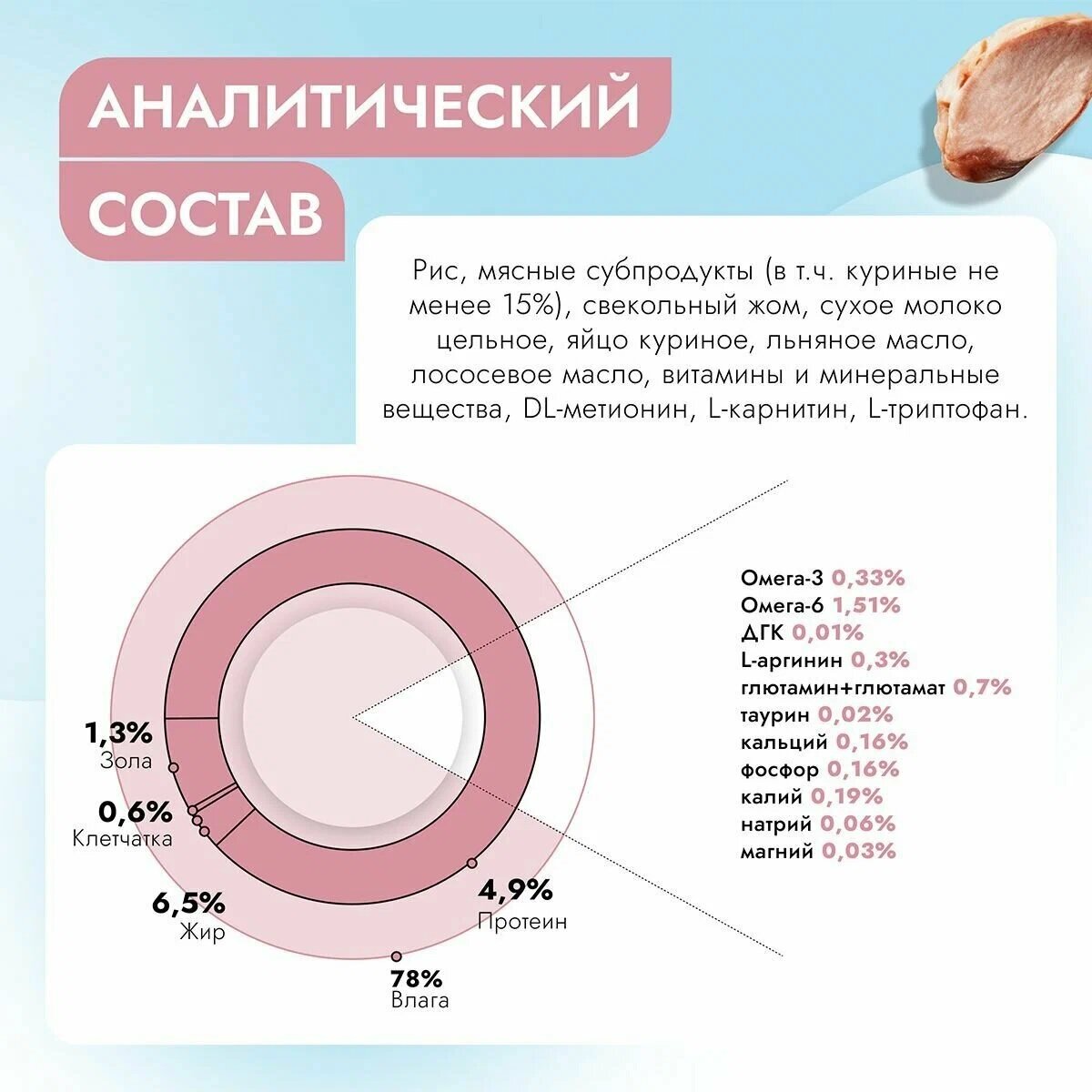 | Дозировка | Норма потребления корма для кошек 30-50 г на кг веса животного в 2 приема кормления. Норма потребления корма для котят 40-60 г на кг веса животного в 2-3 приема кормления |
