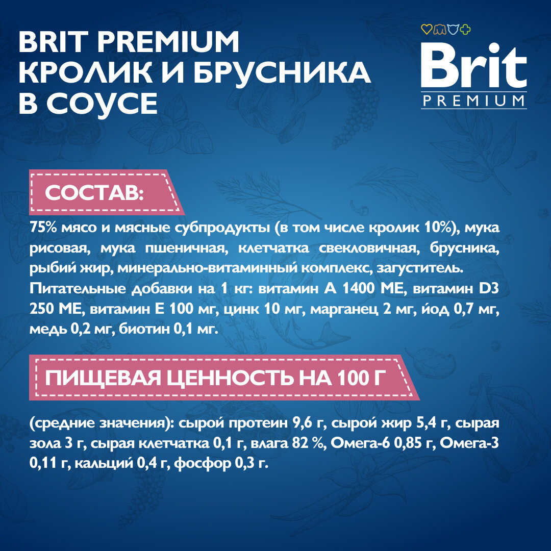 BRIT PREMIUM, Пауч для взрослых стерил. собак мини пород, Кролик и брусника в соусе, 85гр, 14шт