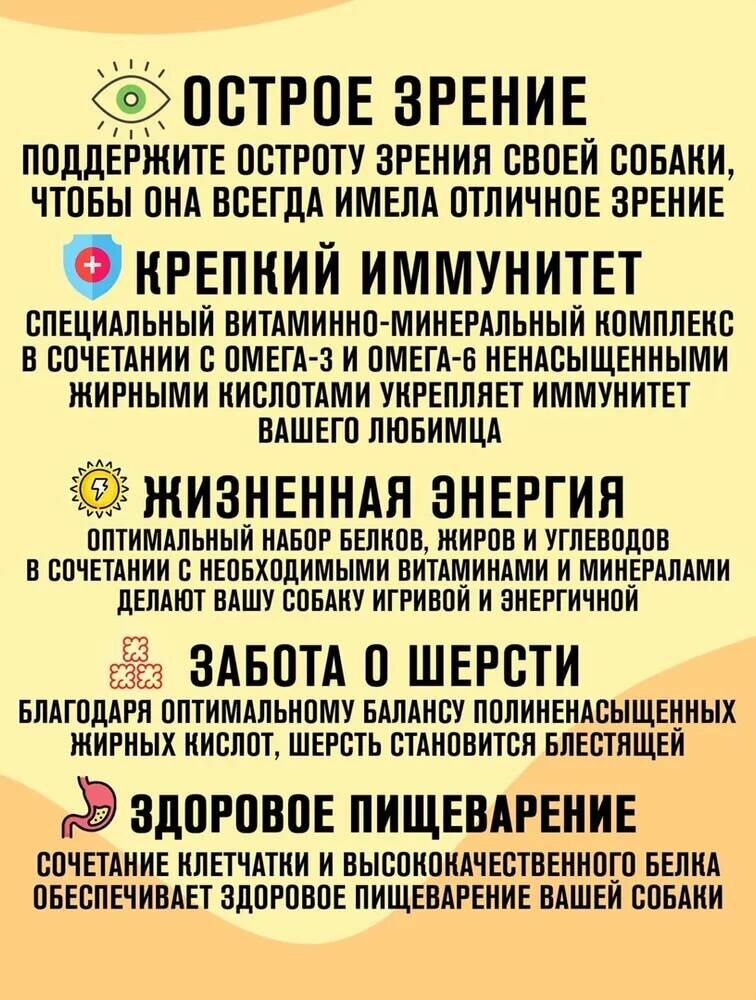 | Дополнительная информация | благодаря сбалансированному содержанию белка корм удовлетворяет высокие энергетические потребности собак и способствует прекрасному аппетиту |