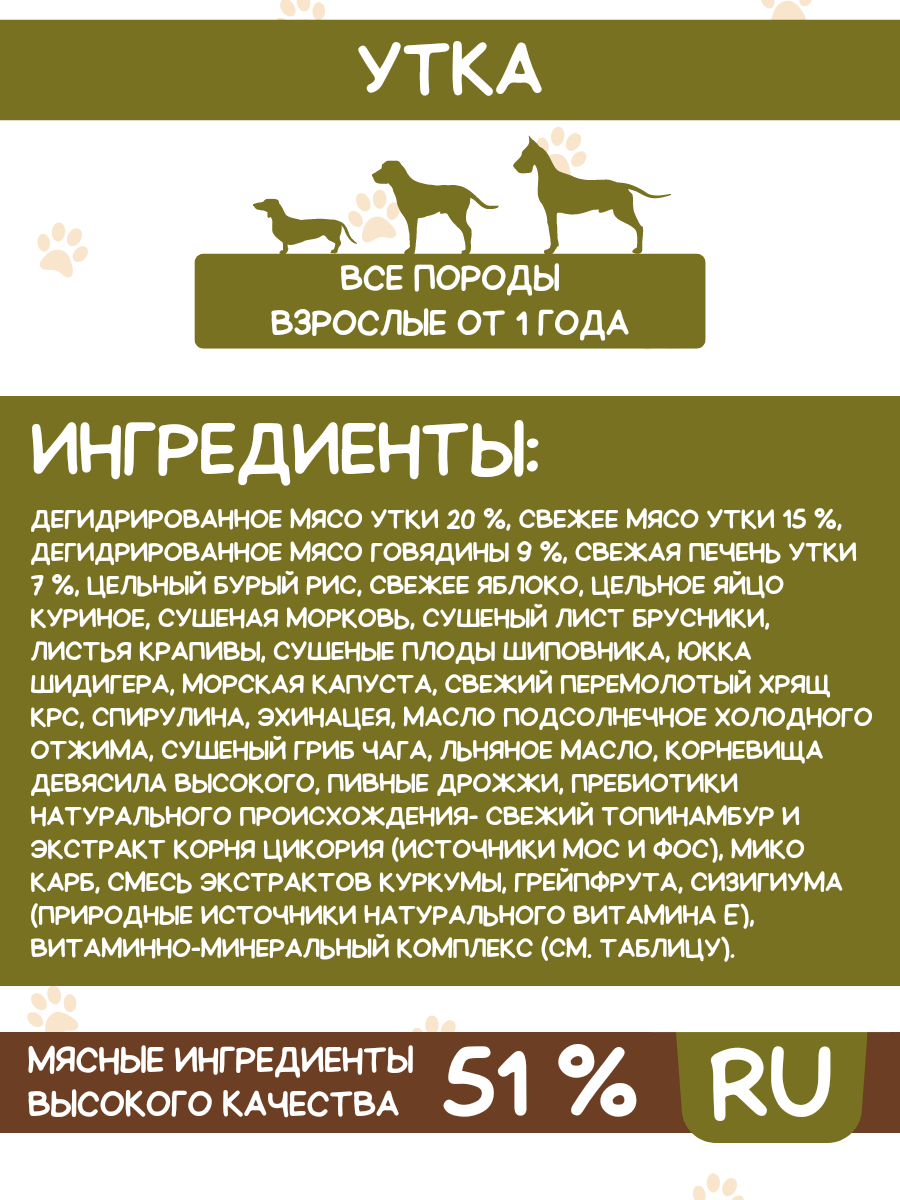 | Состав | дегидрированное мясо утки 20%, свежее мясо утки 15%, дегидрированное мясо говядины 9%, свежая печень утки 7%, цельный бурый рис, свежее яблоко, цельное яйцо куриное, сушеная морковь, сушеный лист брусники, листья крапивы, сушеные плоды шиповника, Юкка Шидигера, морская капуста, свежий перемолотый хрящ КРС, спирулина, эхинацея, масло подсолнечное холодного отжима, сушеный гриб Чага, льняное масло, корневища девясила высокого, пивные дрожжи, пребиотики натурального происхождения- свежий топинамбур и экстракт корня цикория, Мико Карб, смесь экстрактов куркумы, грейпфрута, сизигиума, витаминно-минеральный комплекс |