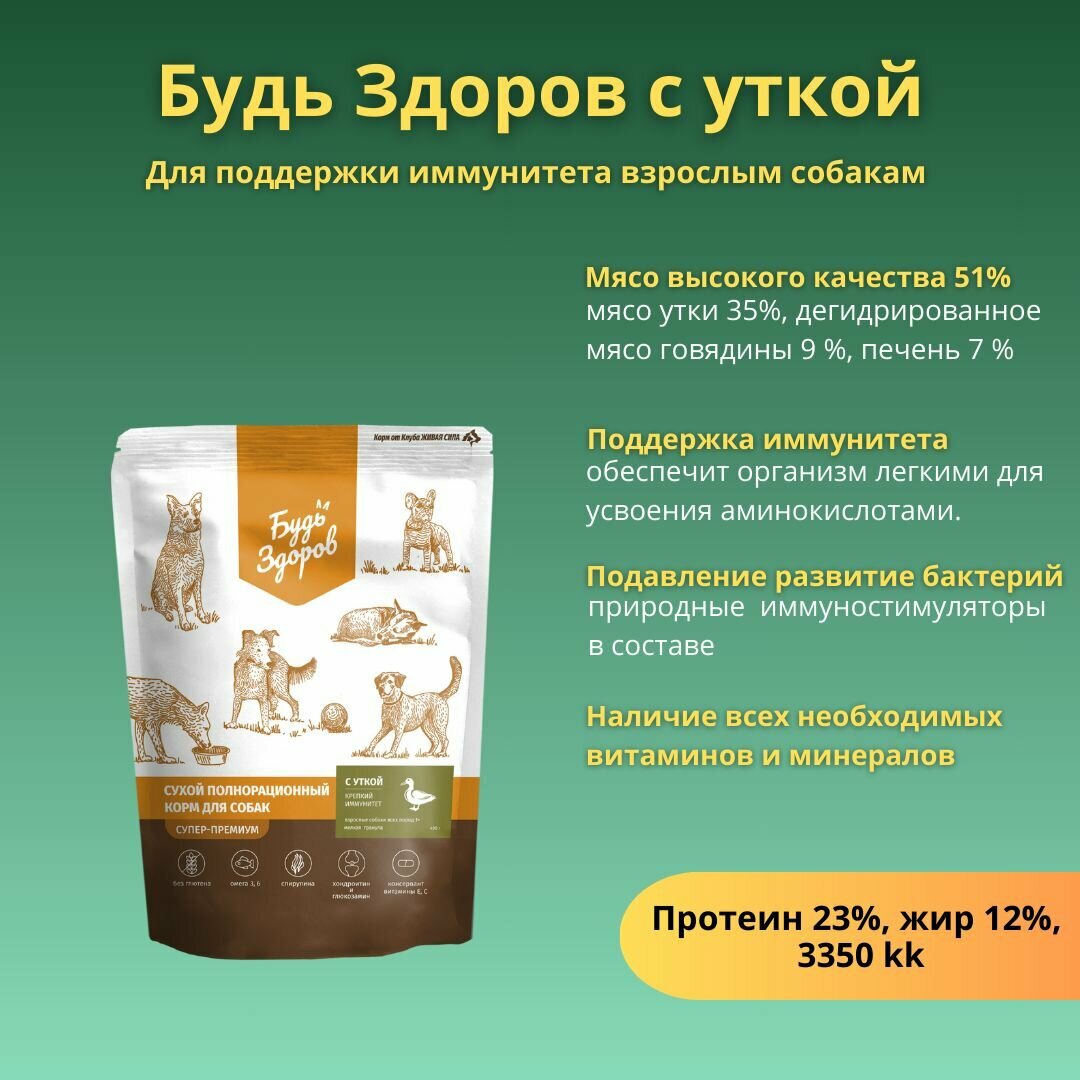 Живая Сила Будь Здоров сухой корм с уткой для взрослых собак всех пород. Крепкий иммунитет. Мелкая гранула 0.4 кг