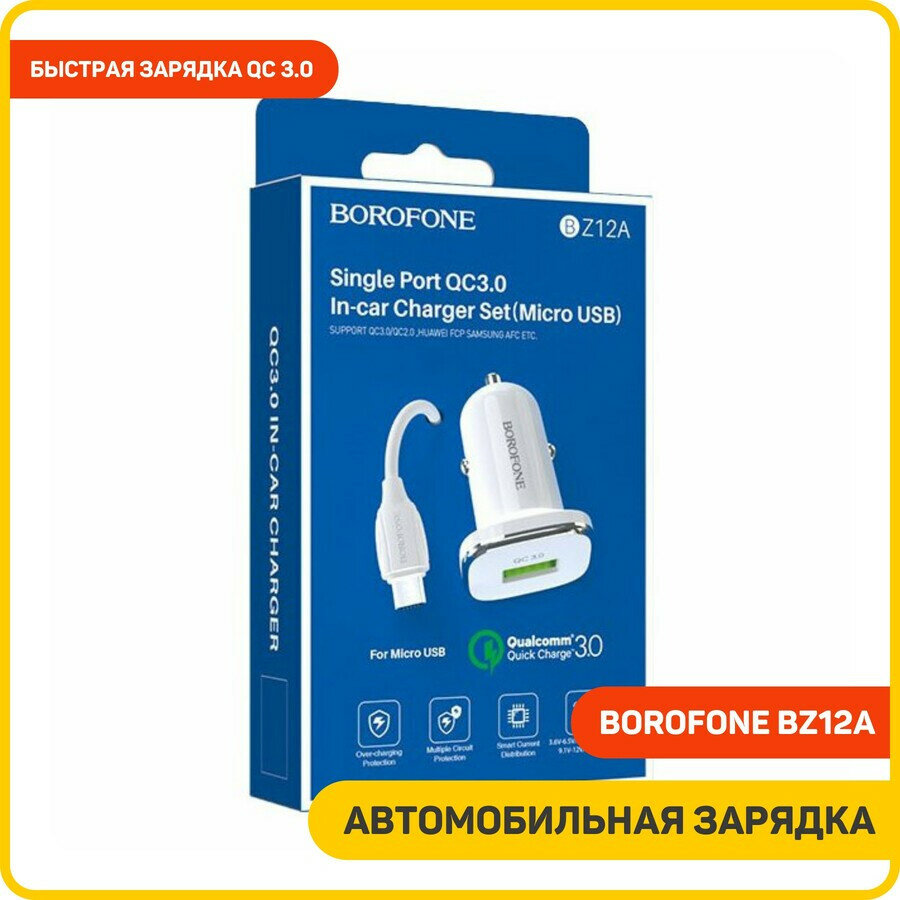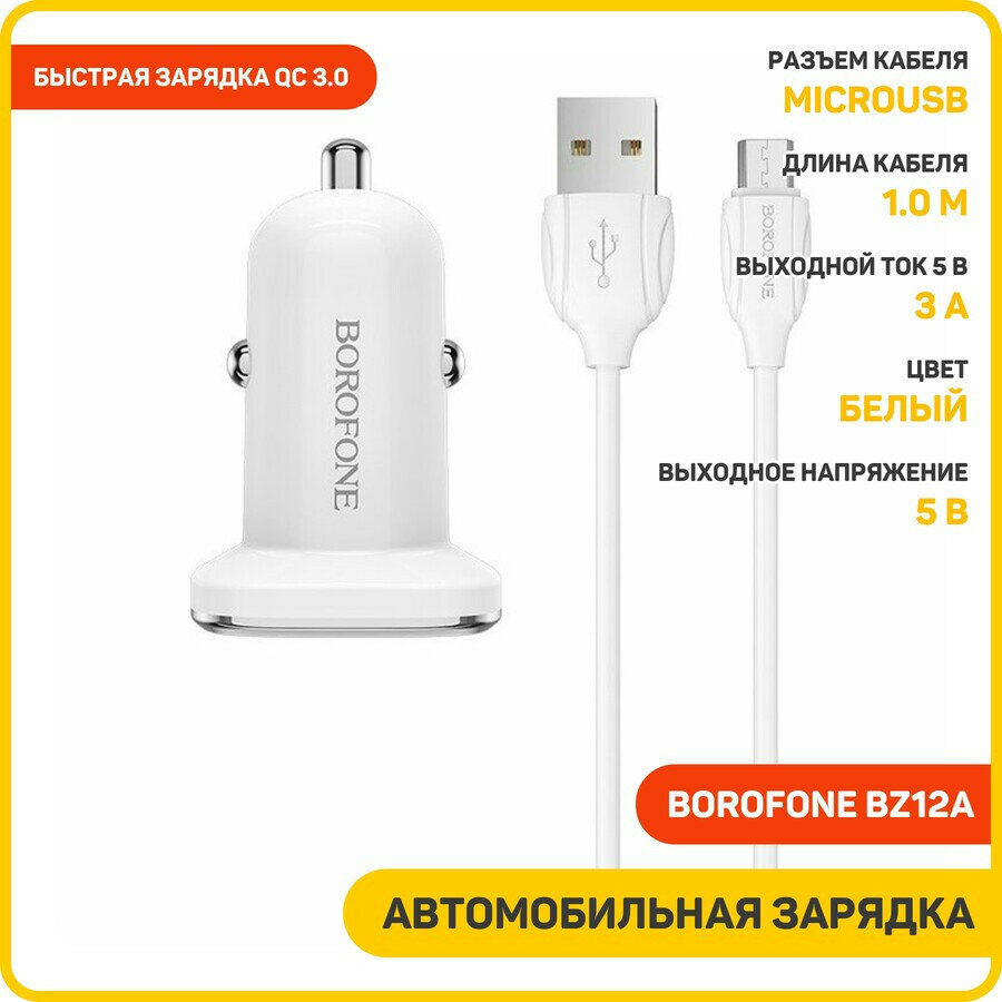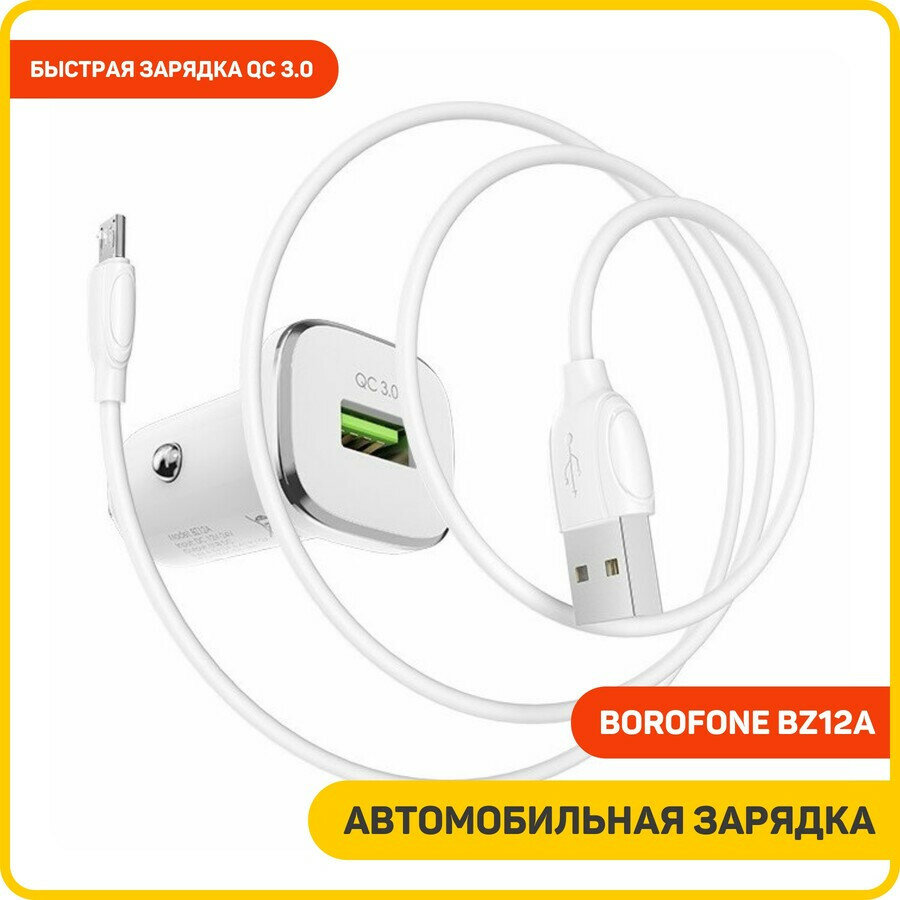 Автомобильное зарядное устройство (АЗУ) Borofone BZ12A QC 3.0 (USB) + кабель MicroUSB, 3 А, белый
