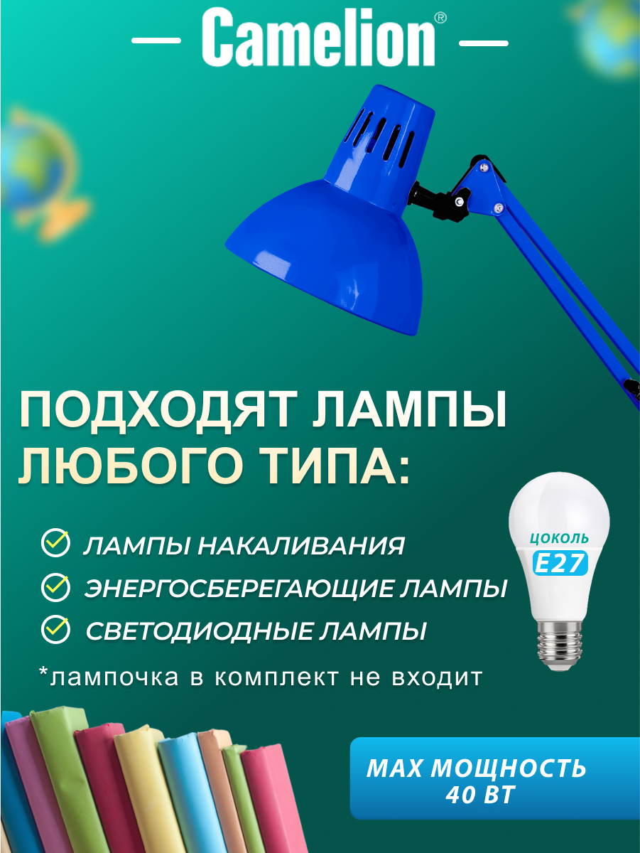 Лампа офисная Camelion Light Solution KD-312 C06, E27, 60 Вт, цвет арматуры: синий, цвет плафона/абажура: синий