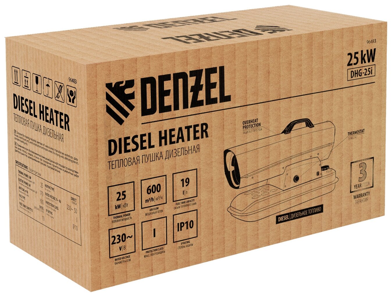 Купить Дизельная тепловая пушка Denzel DHG-25i 25 кВт, 600 м3/ч, прямой нагрев, термостат 96483