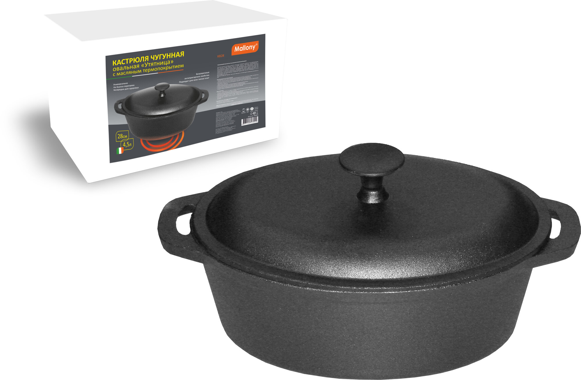 Кастрюля "утятница" чугунная Mallony KВ28 с масляным термопокрытием, овальная, 28 см, 3,9 л