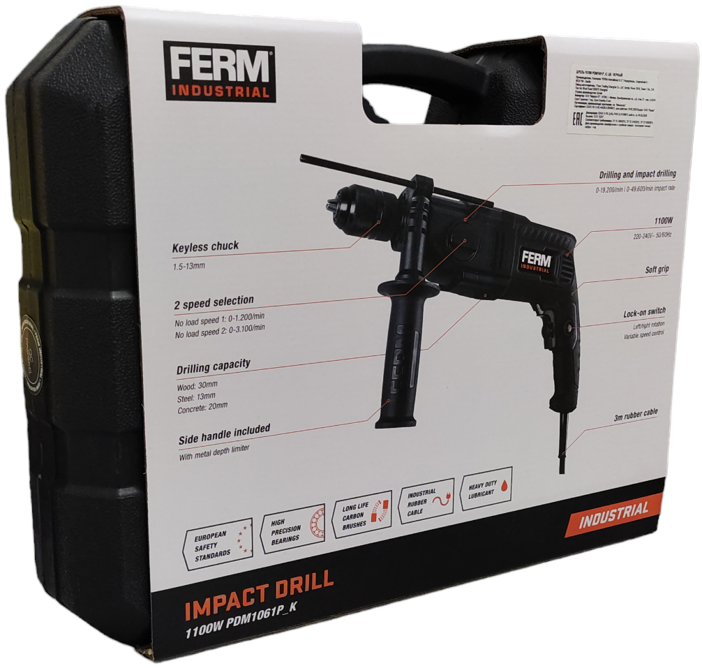 Ударная дрель FERM Industrial PDM1061P, быстрозажимной патрон, реверс, мощность 1100Вт
