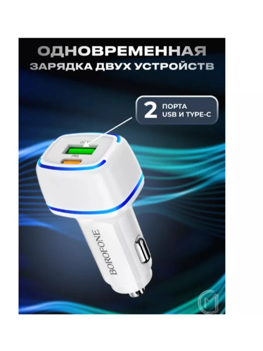 Автомобильное зарядное устройство Borofone BZ12B Lasting Power PD 18W, 3A + USB-C кабель Lightning 8-pin, 1м, белый