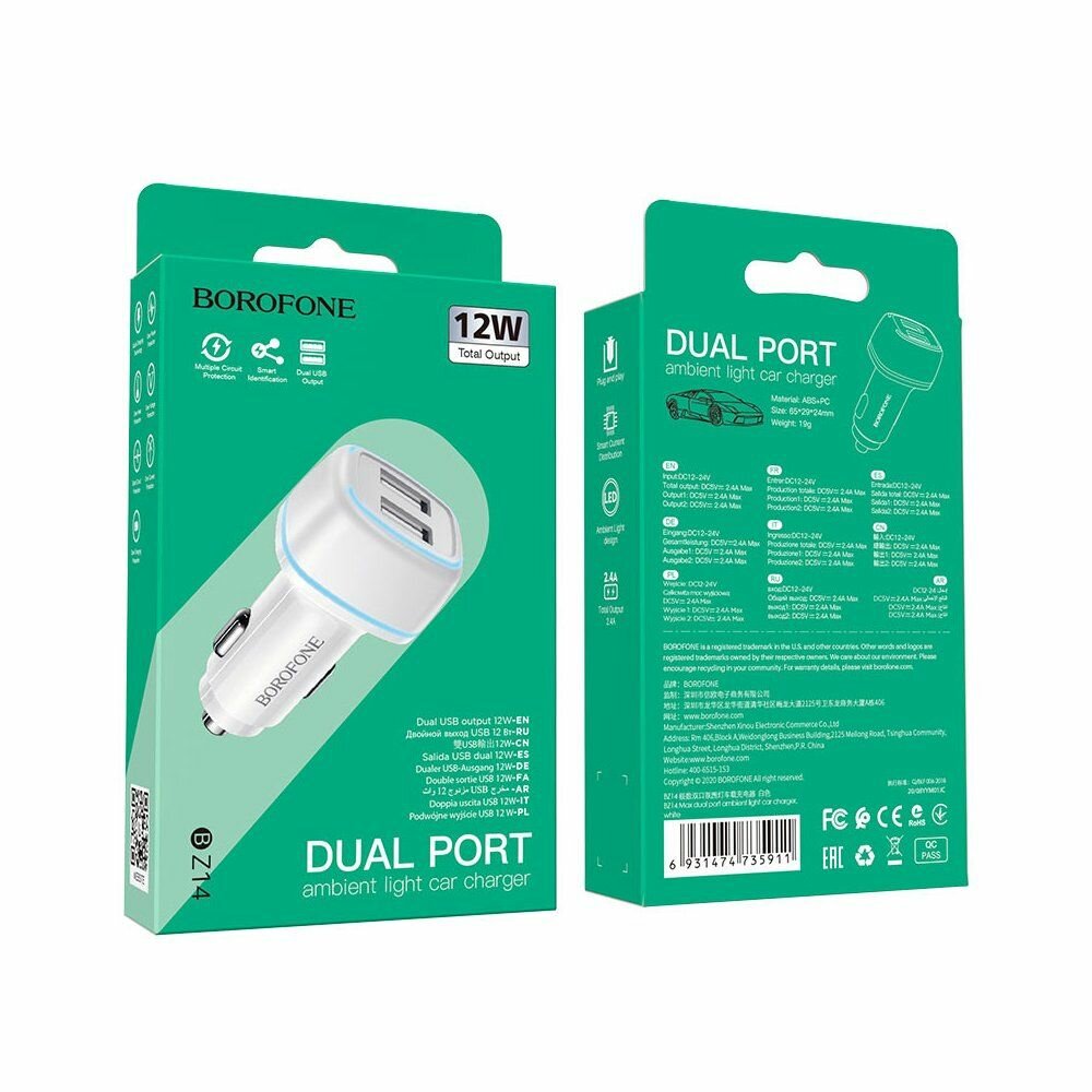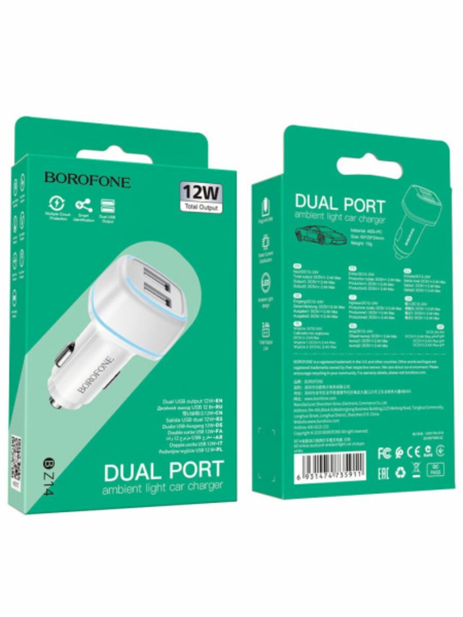 Автомобильное зарядное устройство BOROFONE BZ14 Max, 2xUSB, 2.4A, белый