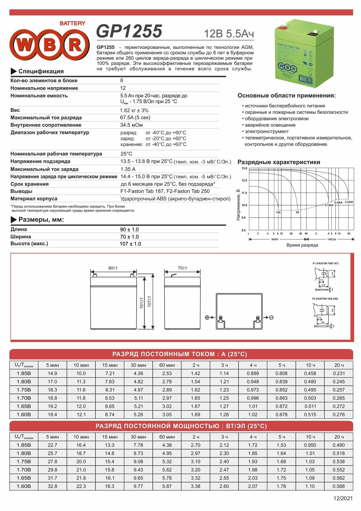 | Дополнительная информация | Аккумулятор WBR GP 1255 F2 с напряжением 12 В и ёмкостью 5.5 Ач предназначен для общего применения и использует технологию AGM (стекловолоконные сепараторы, пропитанные электролитом). Его срок службы составляет 8 лет в буферном режиме и 260 циклов при 100% глубине разряда. |