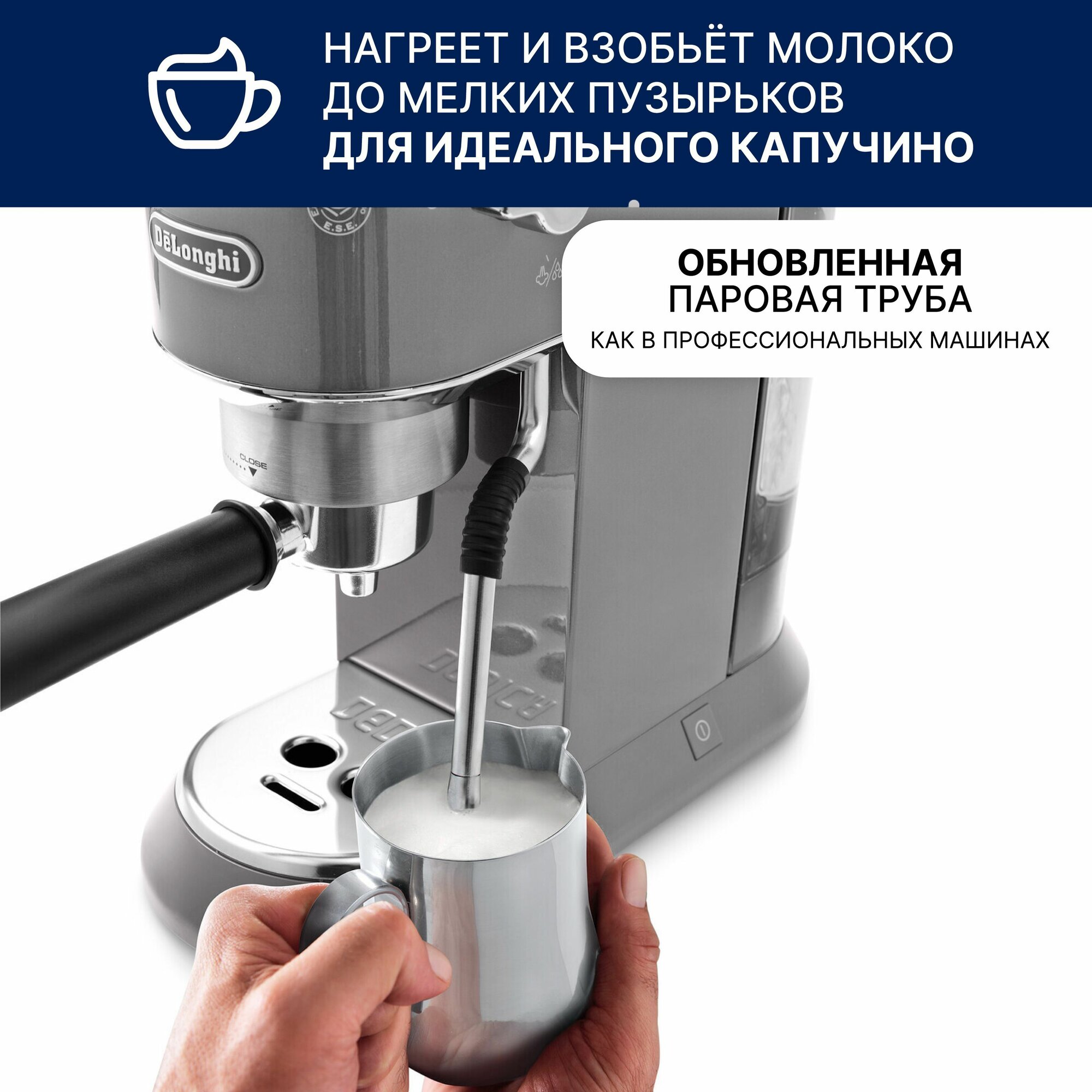 2) Обновленная паровая трубка, используемая обычно в более профессиональных моделях 3) Металлический темпер и питчер в комплекте 4) На бачке с водой теперь есть инструкция на английском по очищению от накипи. |