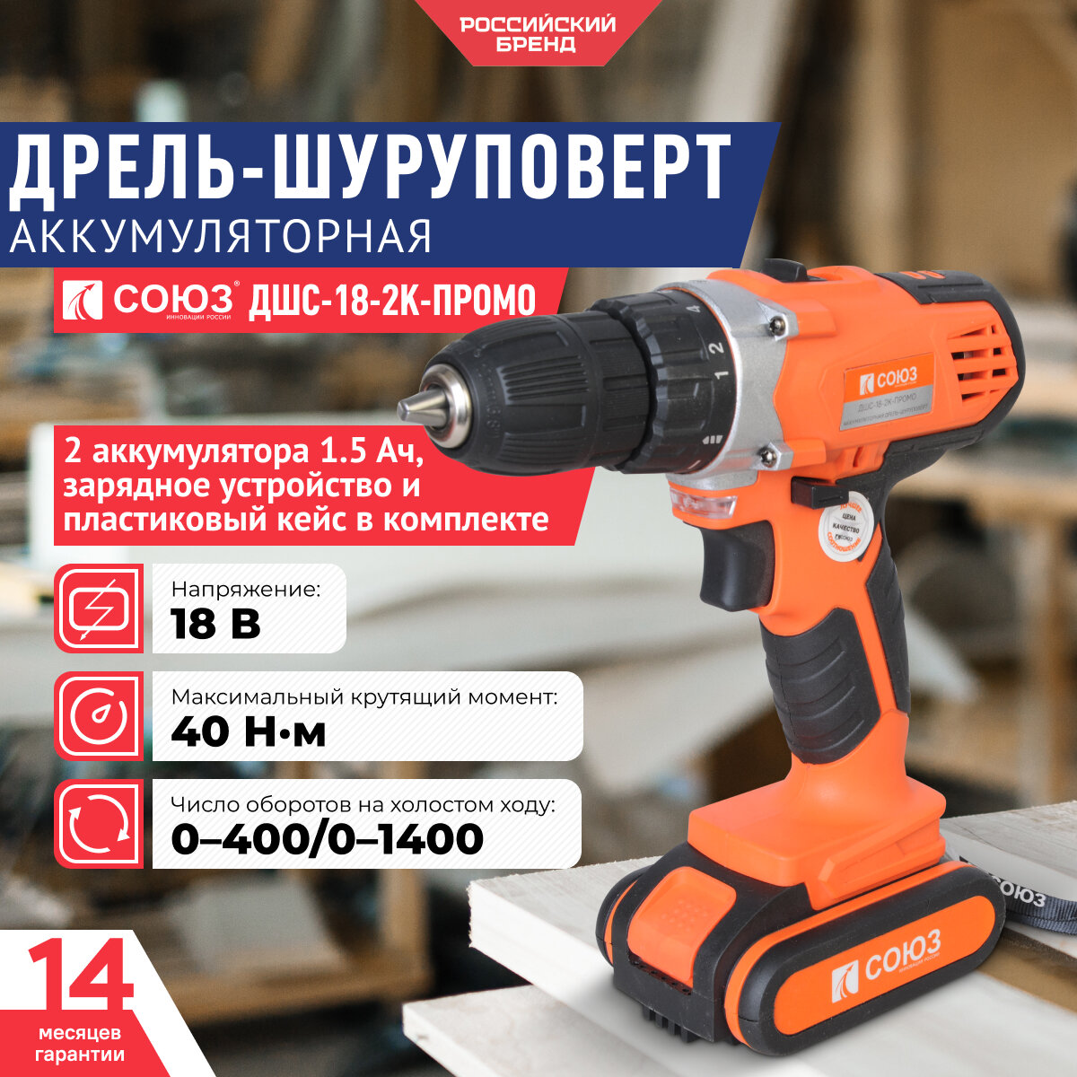 Аккумуляторный шуруповерт СОЮЗ ДШС-14-2К-ПРОМО