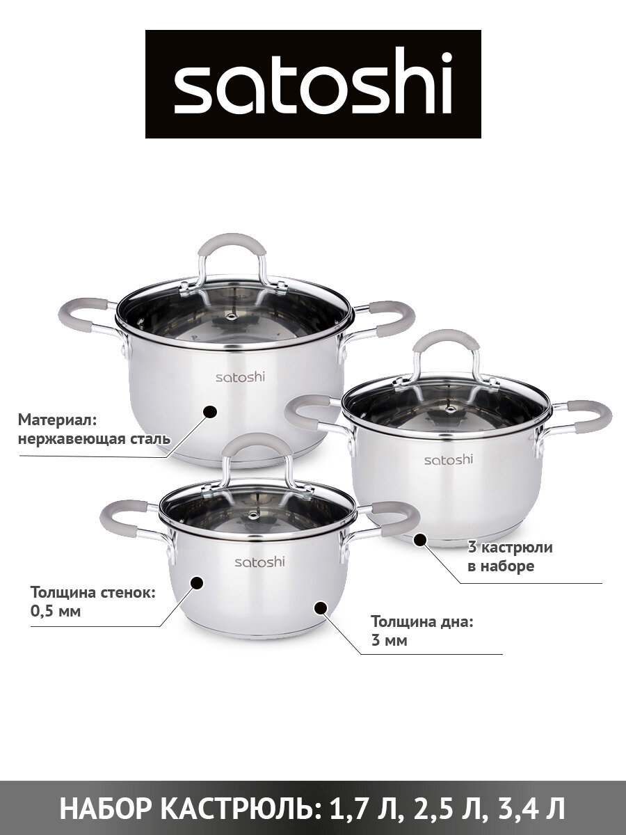 Набор кастрюль Satoshi Альбер: 1,7 л, 2,5 л, 3,4 л со стеклянными крышками, нержавеющая сталь, индукция интересное: