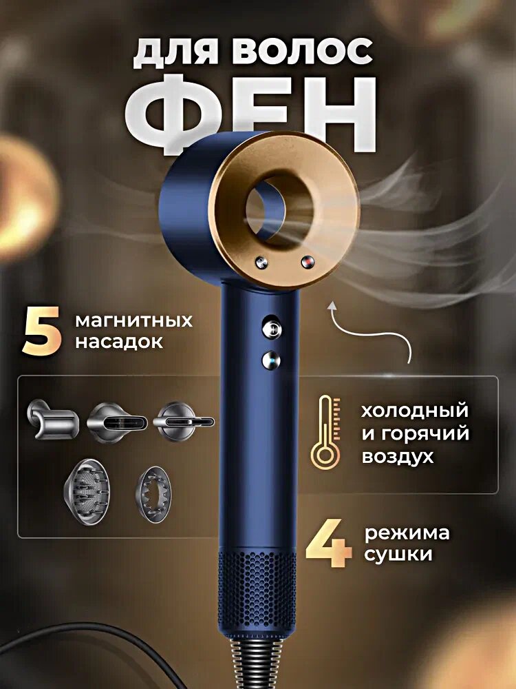Фен профессиональный/ Самый мощный скорости/ 3 температурных режима / 5 магнитных насадок/Золотой Гарантия качества