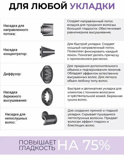 | Подробная комплектация | фен, насадка-концентратор 2 шт (широкий и зауженный профиль), диффузор, насадка для бережного высушивания, насадка для непослушных волос, инструкция |