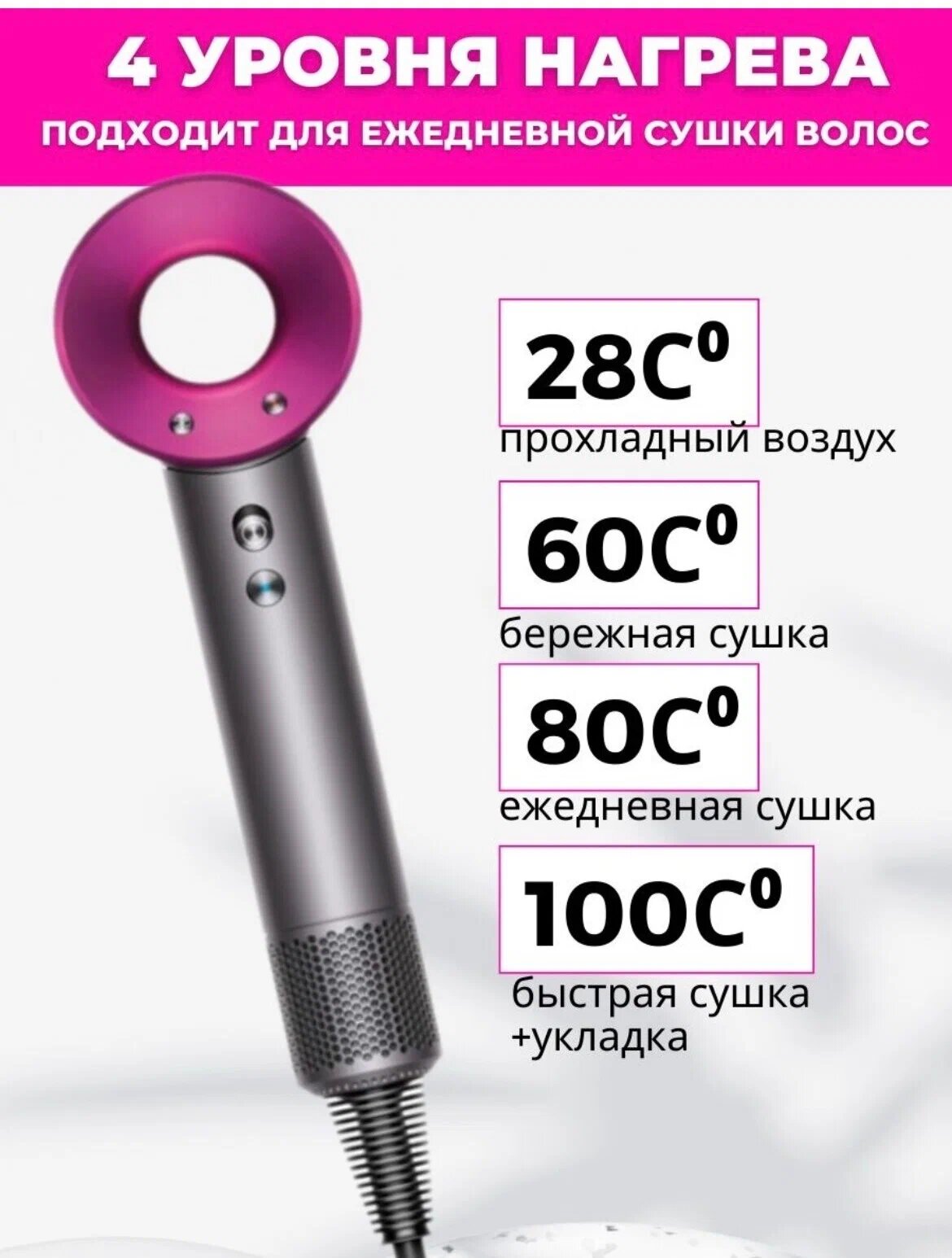Профессиональный фен для волос Hair-1600 Super Hair Dryer 1600 Вт, 3 режима, 5 магнитных насадок, ионизация воздуха, розовый