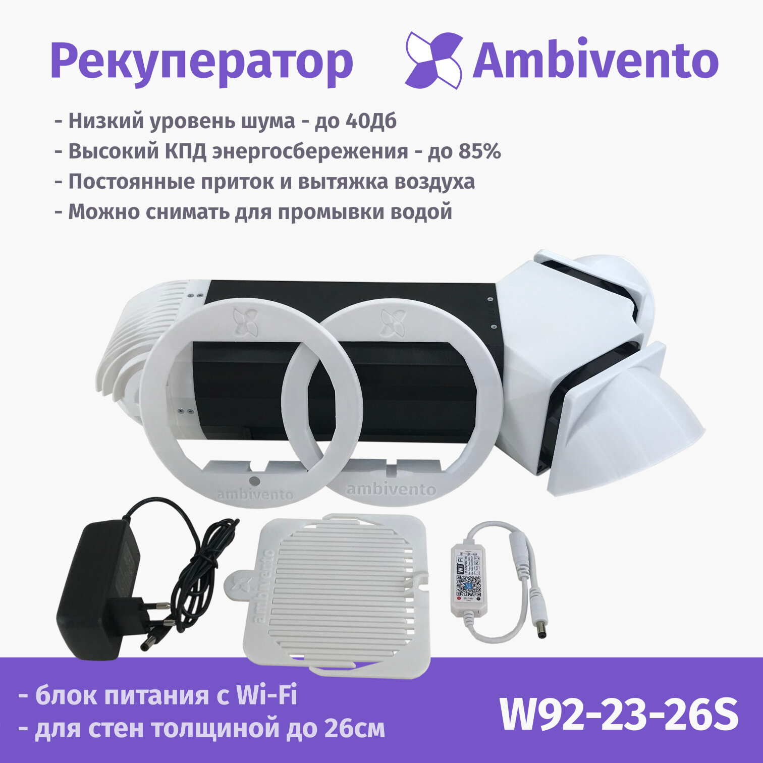 Купить Съемный рекуператор воздуха Ambivento для стен толщиной 23-26см c умным Wi-Fi блоком питания