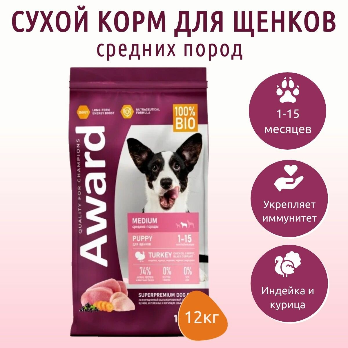 Купить AWARD MEDIUM PUPPY для щенков, беременных и кормящих сук средних пород с индейкой и курицей 12 кг