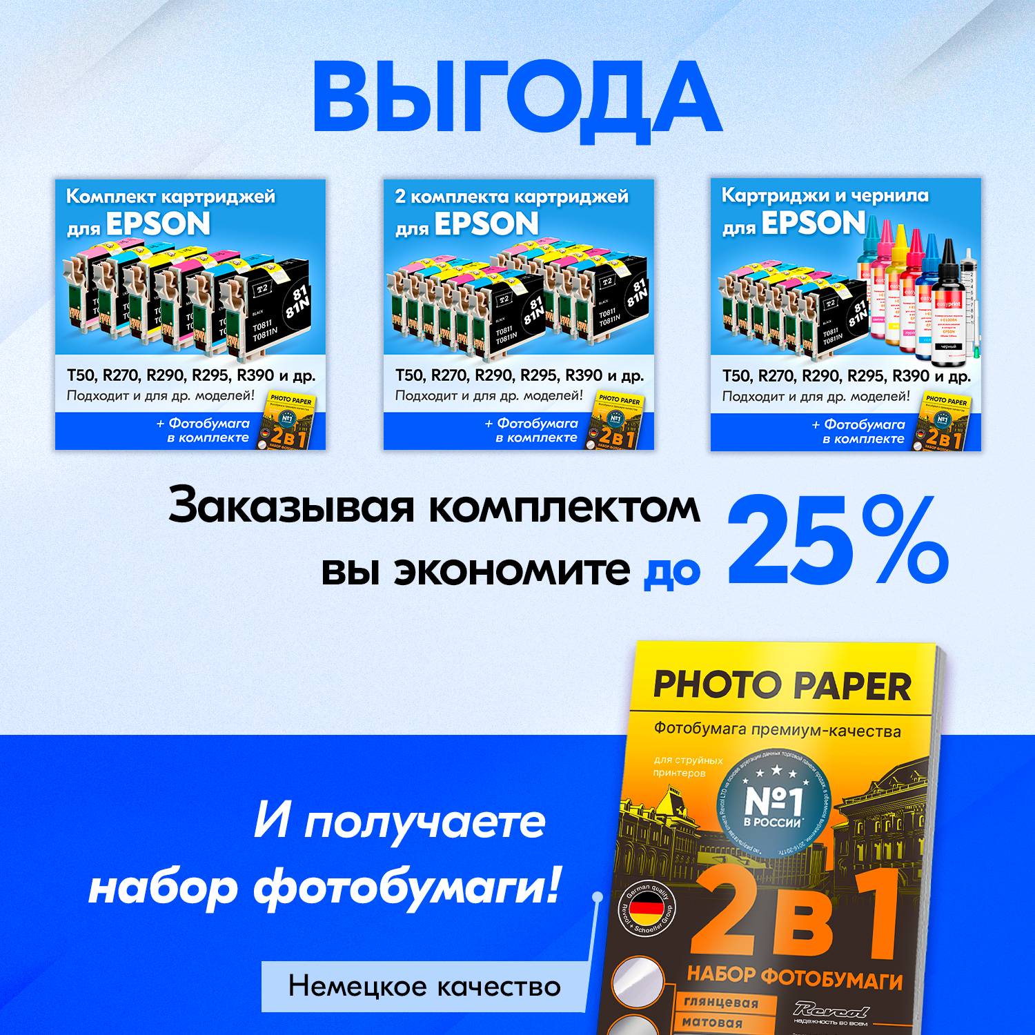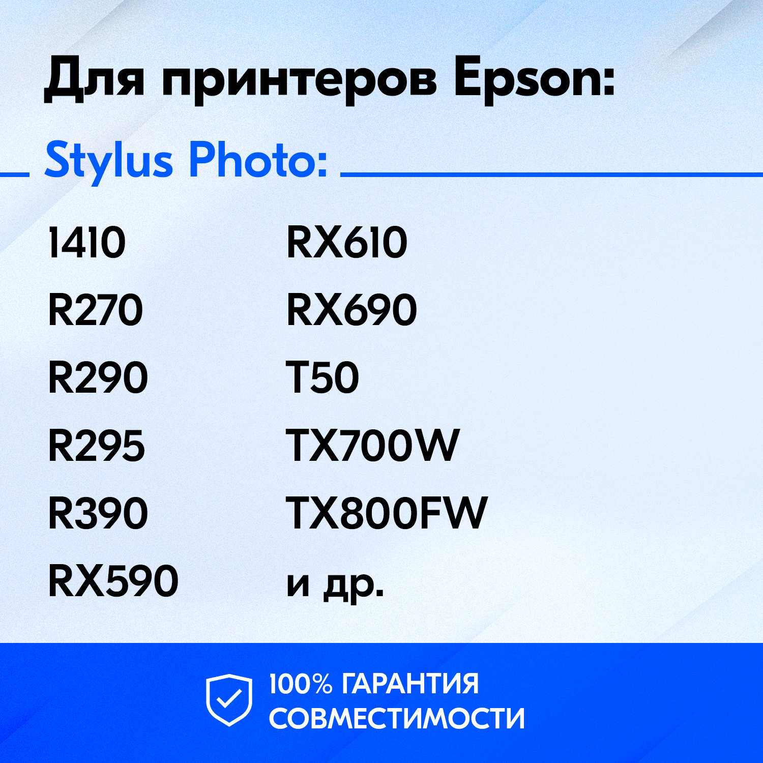 | Модель совместимого принтера | Epson Stylus Photo 1410 / Epson Stylus Photo R270 / Epson Stylus Photo R290 / Epson Stylus Photo R295 / Epson Stylus Photo R390 / Epson Stylus Photo RX590 / Epson Stylus Photo RX610 / Epson Stylus Photo RX615 / Epson Stylus Photo RX690 / Epson Stylus Photo T50 / Epson Stylus Photo T59 / Epson Stylus Photo TX650 / Epson Stylus Photo TX659 / Epson Stylus Photo TX700W / Epson Stylus Photo TX710W / Epson Stylus TX700 |