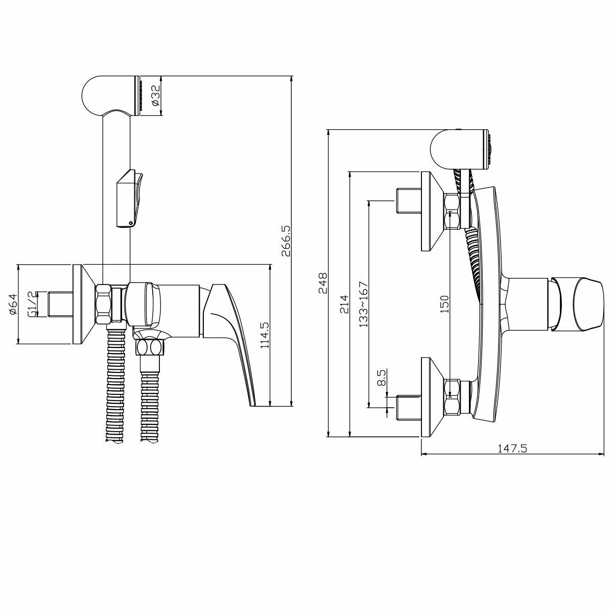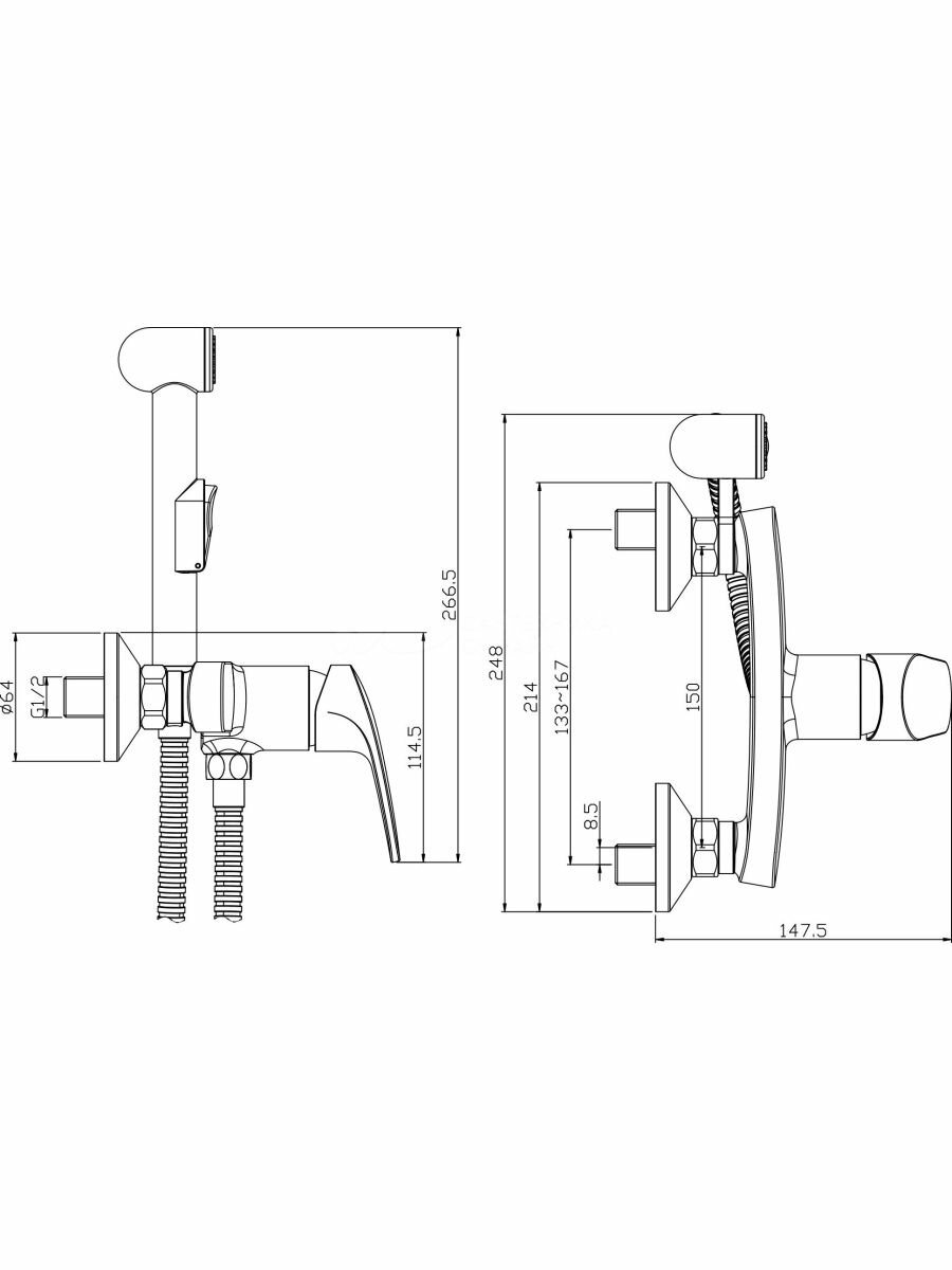 | Комплектация | Смеситель / шланг 1,2 м / лейка гигиенического душа с нажимным механизмом / присоединительная группа для настенного крепления |