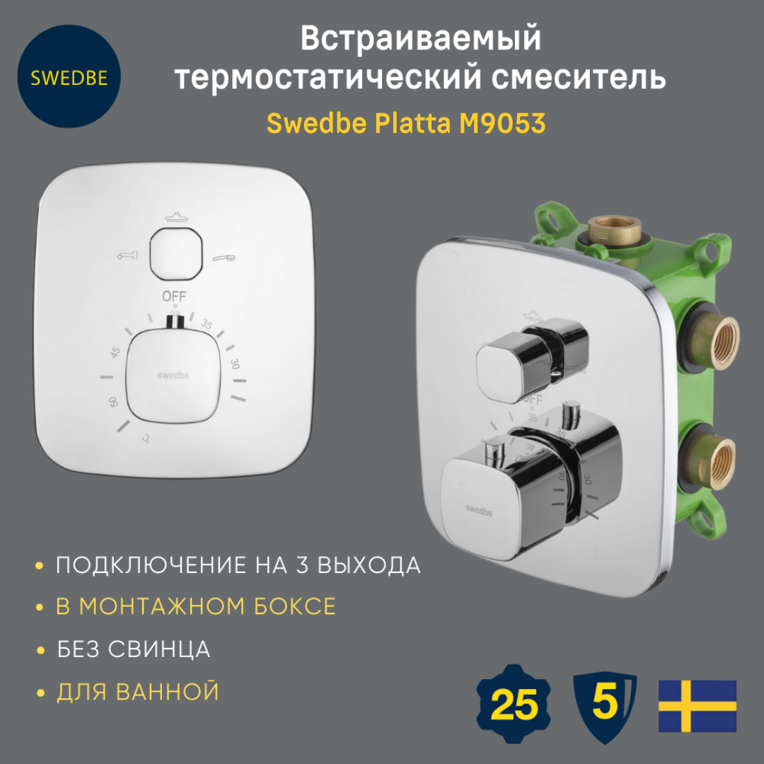 Встраиваемый термостатический смеситель подключение на 3 выхода в монтажном боксе Swedbe Platta 9032B