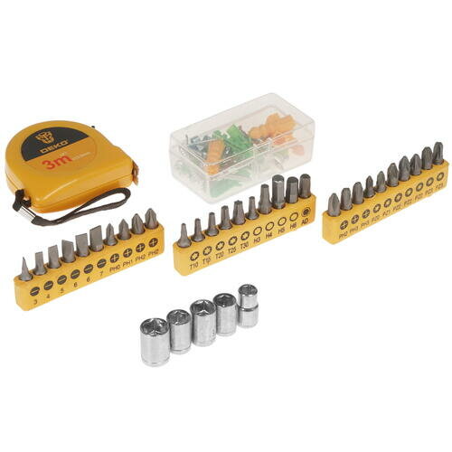 | Подробная комплектация | шуруповерт, биты H (3;4;5;6), магнитный держатель для бит 60 мм, плоскогубцы, прецизионная отвертка 4 шт, молоток с гвоздодером 225 г, набор крепежа 50 шт, адаптер, рулетка, торцевая головка, шестигранные ключи 1.5-6мм 8шт, нож строительный, биты SL (3;4;5;6;6;7), биты PH (0;1;2;2;2;3;3), биты PZ (0;1;2;2;2;3;3), биты T (10;15;20;25;30), ножницы, документация, отверточная рукоятка, аккумулятор, зарядное устройство, кейс |