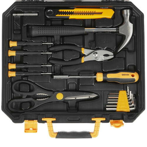 DEKO Аккумуляторная дрель-шуруповерт DKCD20FU-Li в кейсе + 104 предмета, 42 Нм, 20В, 2х1.5 А ч, з у
