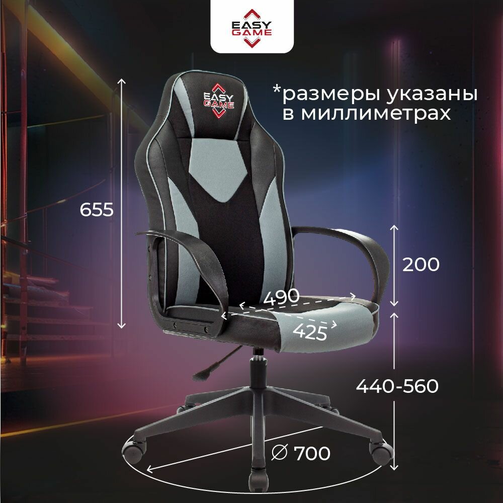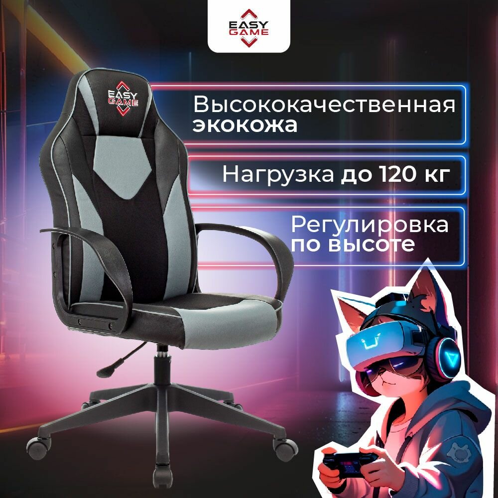 Кресло компьютерное Easy Game игровое, с подлокотниками, экокожа/ткань, крестовина из пластика, черный/серый