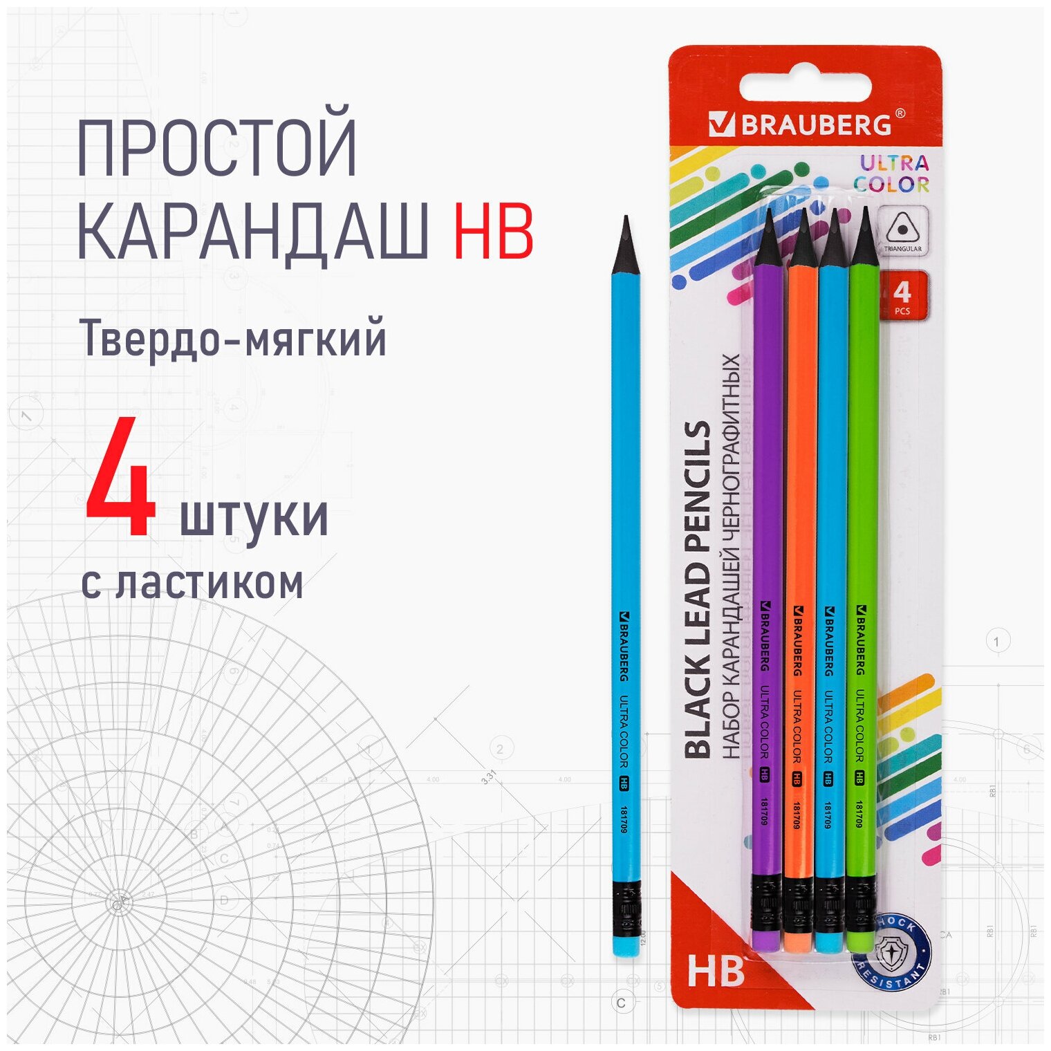 Набор карандашей чернографитных BRAUBERG "ULTRA COLOR" 4 шт., HB, с ластиком, пластиковые, 181709