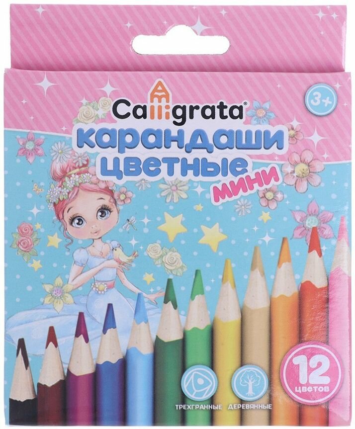 Карандаши цветные Calligrata "мини" в картонной коробке "Принцесса" 12 цветов, корпус треугольный (деревянный)