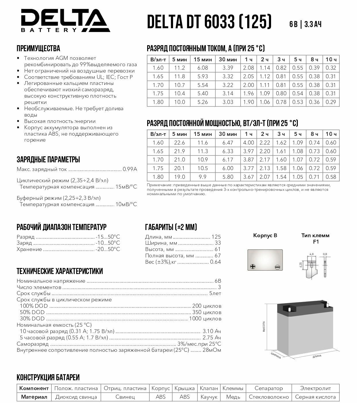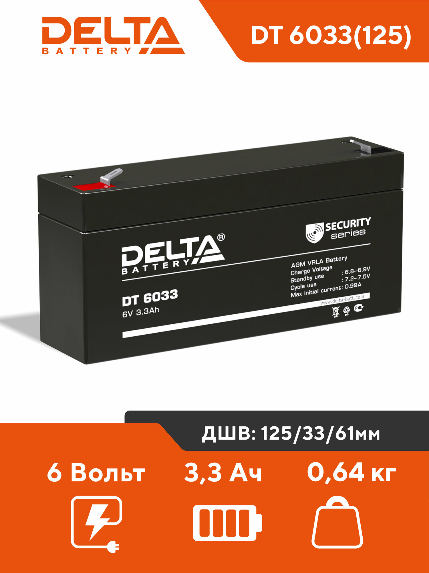 Аккумулятор DELTA DT-6033-125 (6В, 3.3Ач / 6V, 3.3Ah / вывод F1) Для слаботочных систем