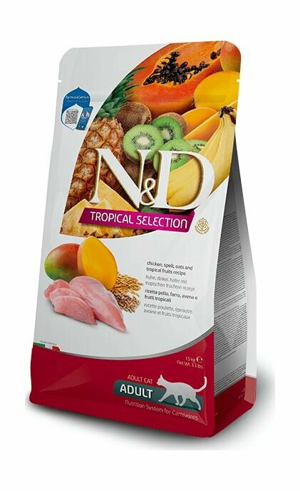 Купить Farmina N&D (Фармина НД) Tropical Selection Сухой низкозерновой корм для взрослых кошек с курицей, спельтой и тропическими фруктами 4+1 кг